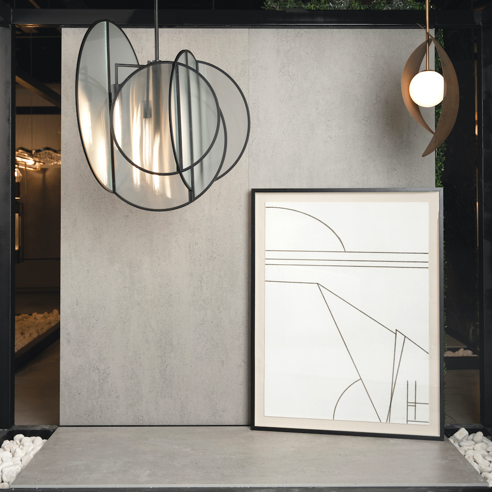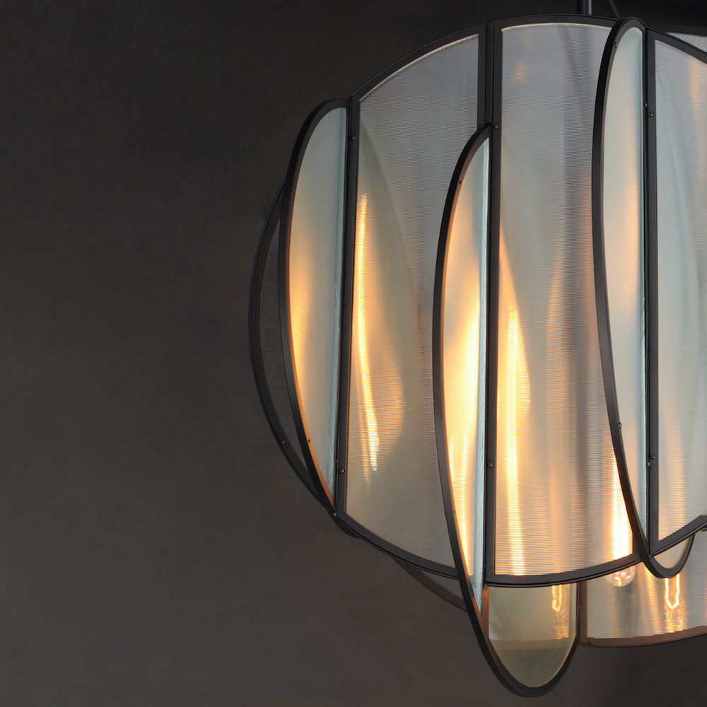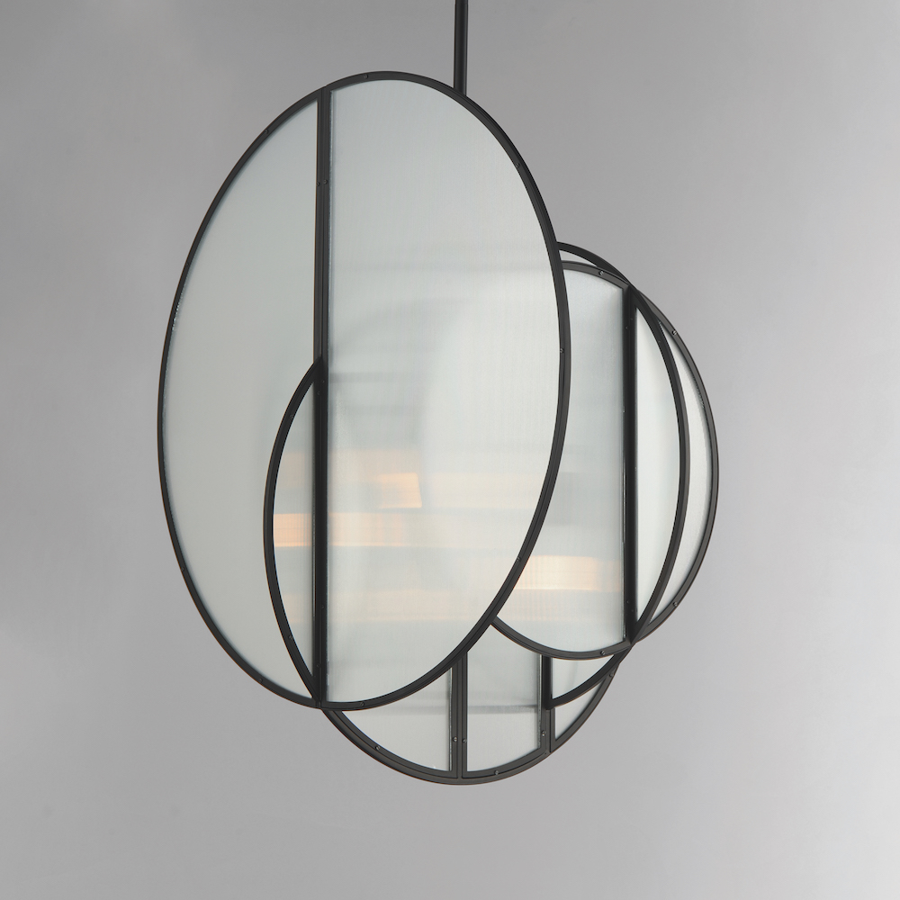 Crossing glass panels are asymmetrically arranged along a rod, framed in thin Matte Black iron. Tubular bulbs suspend from various heights and are obscured by the ribbed glass texture, creating a shimmering display of ambient light. LA-based designer Mat Sanders manages to achieve a retro vibe in the modern configuration of simple circular and arcing glass panes with industrial flair.