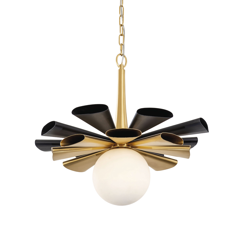 The gold and black fins of the dynamic Daphne pendant from Varaluz are inspired by the radial engine that powered the Ryan NYP Spirit of St. Louis on its record-setting flight. Through CAI Designs.