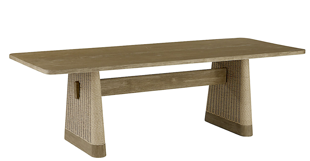 Built of teak wood stained in a rich honey hue, the Delrio Outdoor Dining Table offers the perfect synthesis between Japanese and Southwestern style. A tapered base adds an extra lift to the cantilevered top. Hand-applied synthetic rope in a matching honey finish on each angled leg showcases the true craftsmanship of this design.