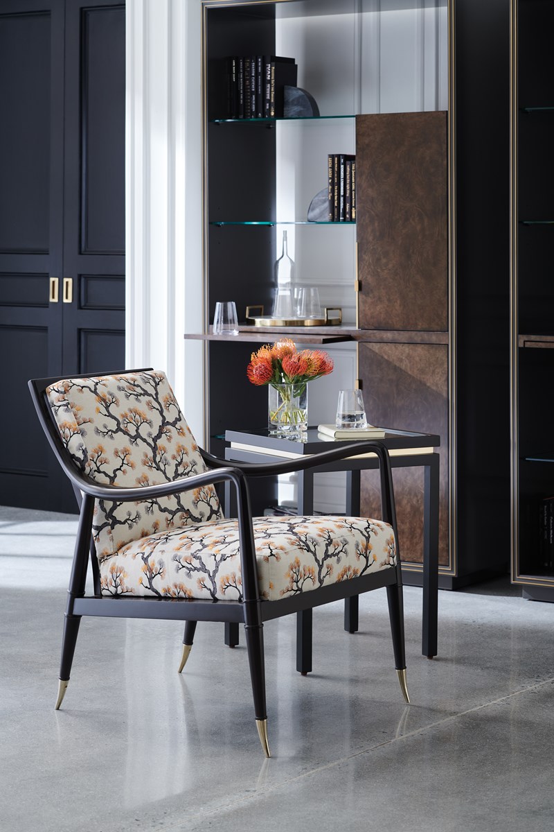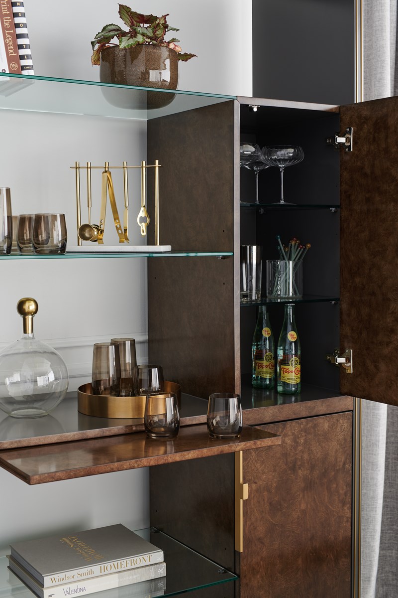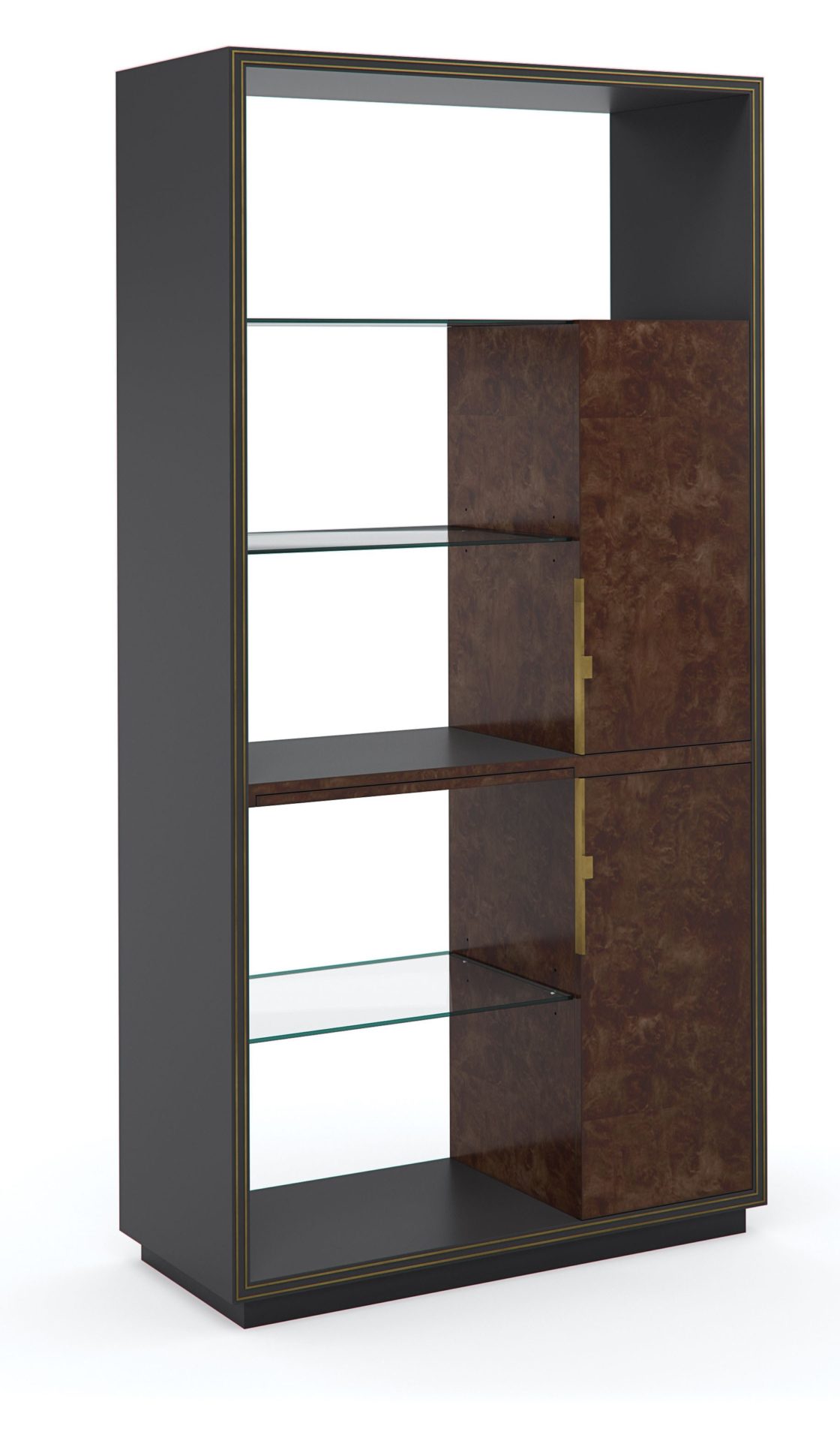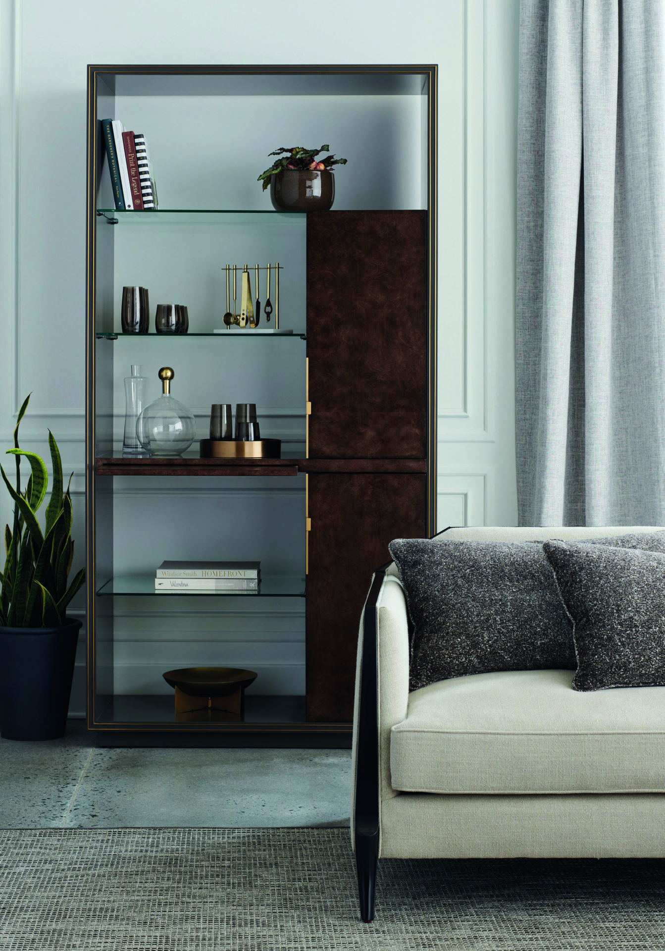 A well-crafted take on functional storage and display, this contemporary cabinet pairs warm wood tones with polished metal for a refined use of materials and finishes. Framed in a Warm Slate finish, its shadow box-like design features ample open space and adjustable glass shelves. On the right, its Sepia burl clad storage space is accented by Champagne Gold hardware, creating the appearance of an asymmetrical, box-within-a-box.