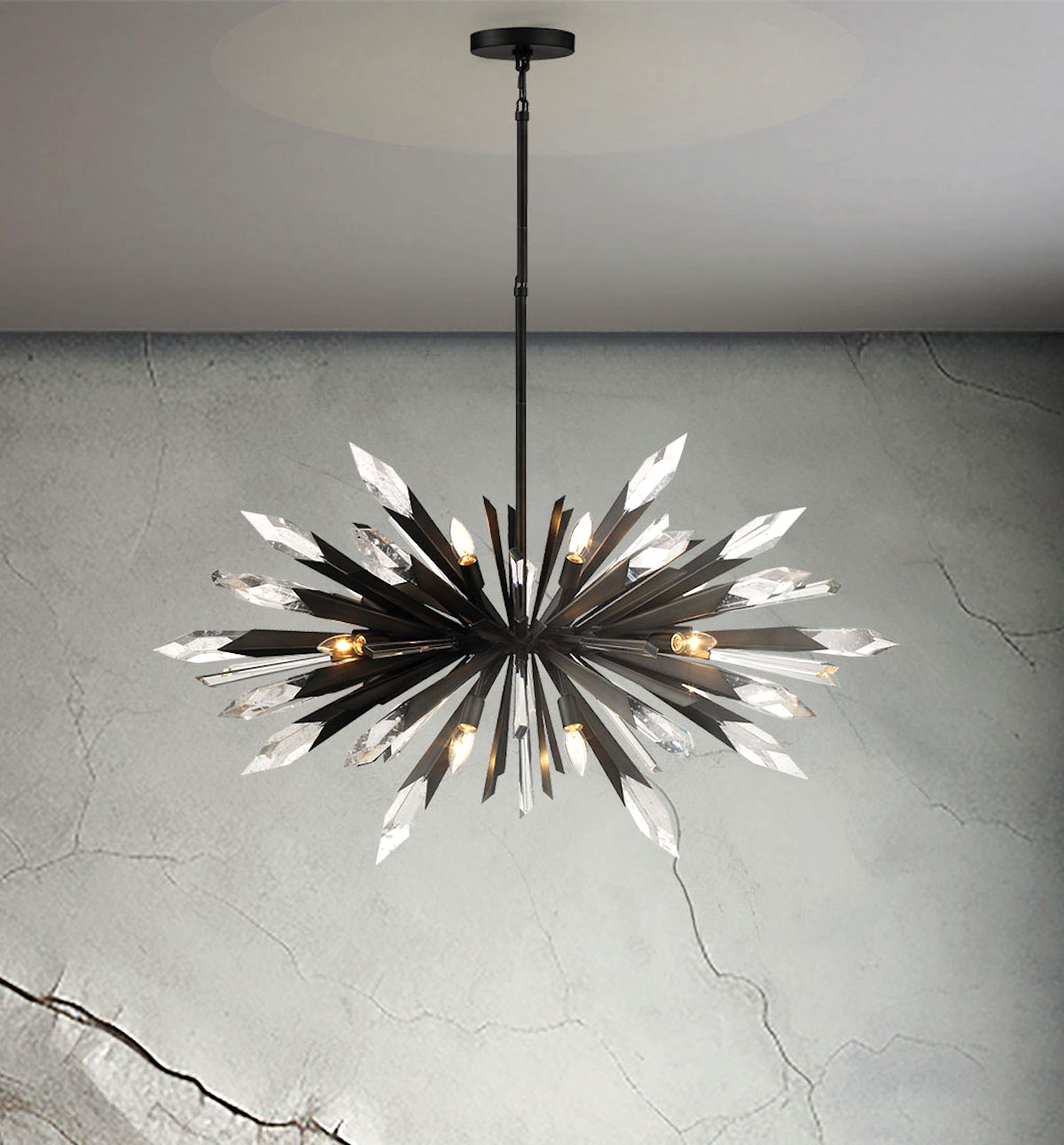 The Elsa Pendant, in a midnight graphite finish with clear crystal and faux rock accents, adds drama to any room. The collection includes pendants and sconce.