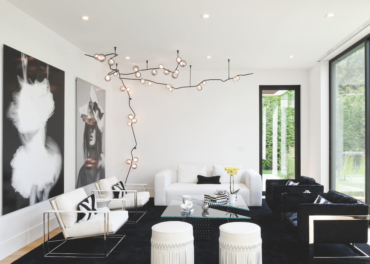 Our team had fun crafting a fixture to play in this glamorous space; the clients needed a statement- making piece that could bring as much drama to the room as their gorgeous black and white art.