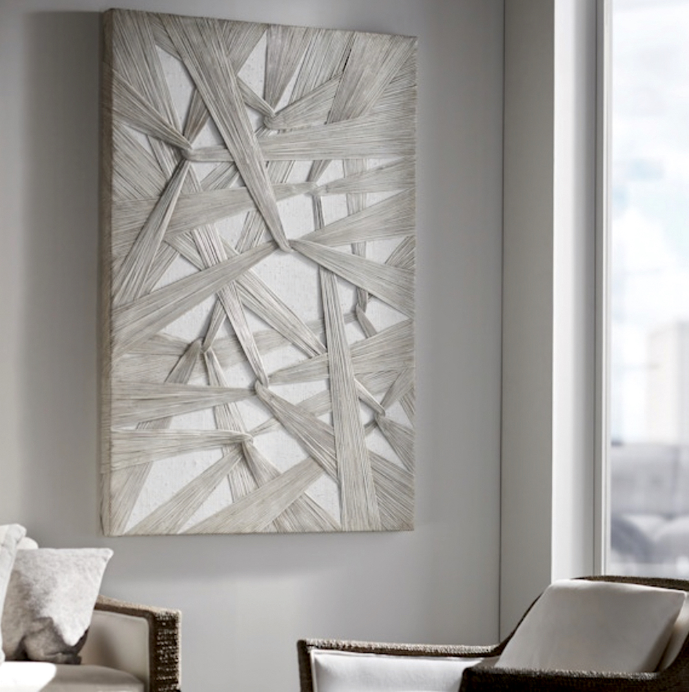 To create this Janell Wall Decor, natural split rattan in a grey wash finish is intricately placed over a whitewashed raffia background all over a hardwood frame.