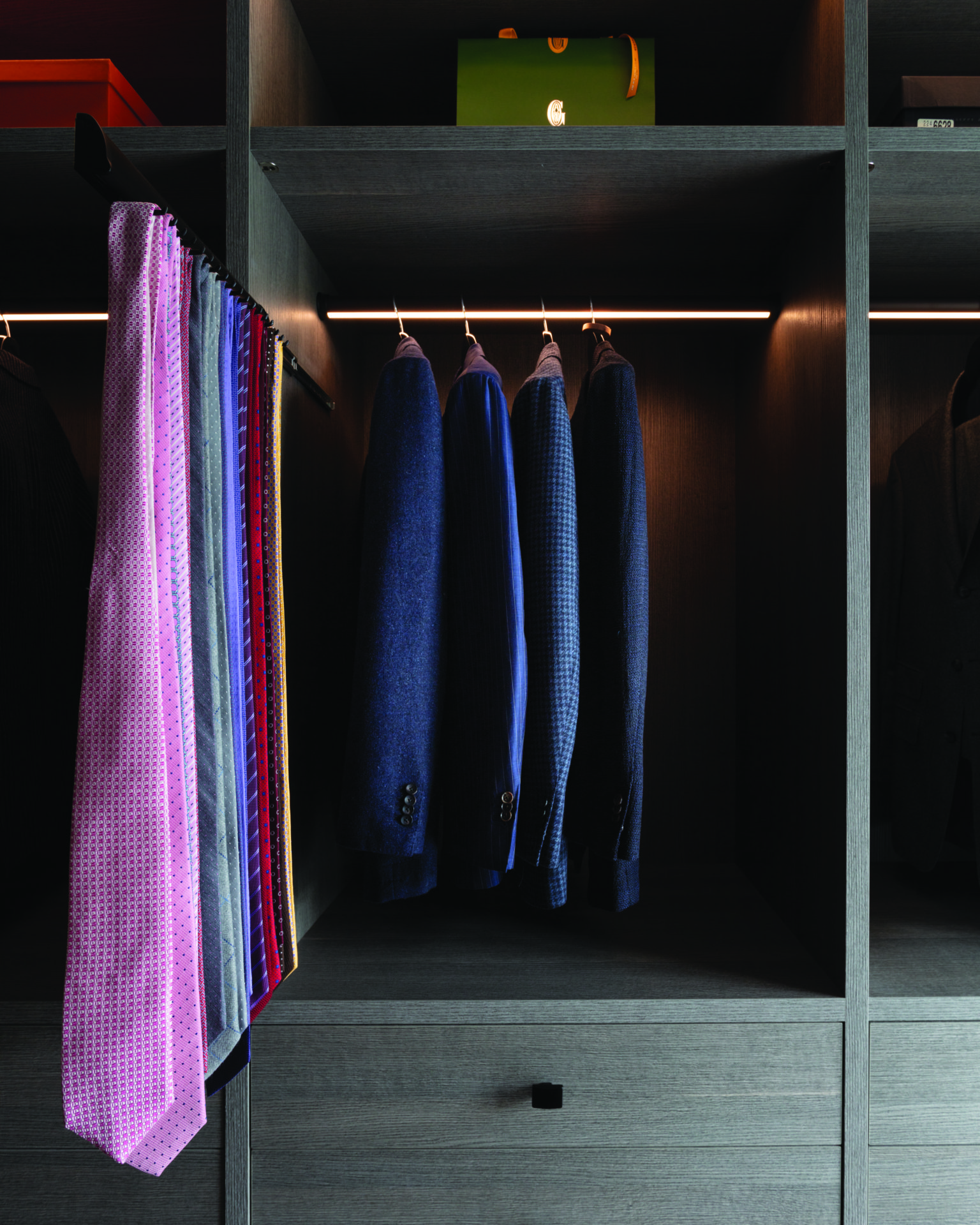 Take your fully customizable closet system to the next level with California Closets’ exclusive closet accessories. Hanging poles with LED lighting strips and easily retractable tie racks make all the difference when organizing your closet.