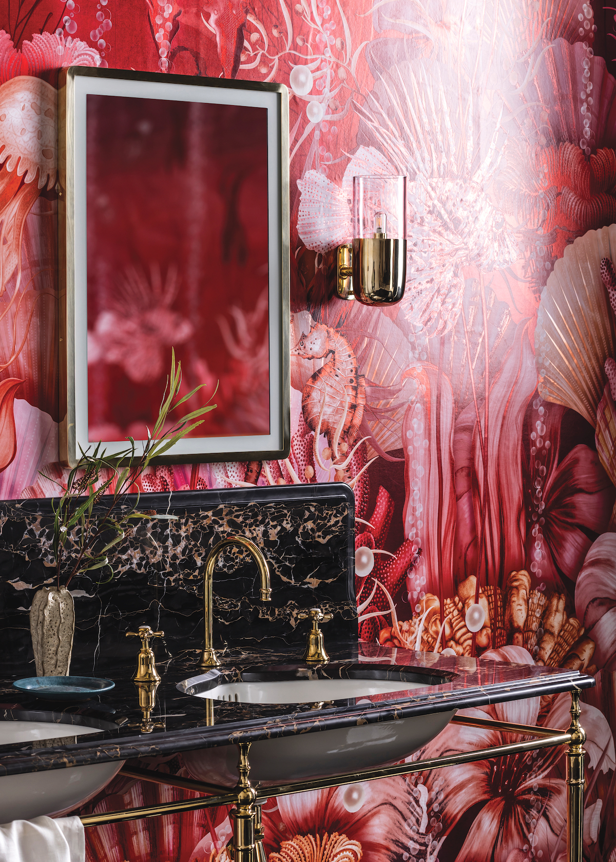 The Mull swan neck faucet and Clarendon medicine cabinet mirror from Drummonds serve as striking centerpieces in this lush bathroom.