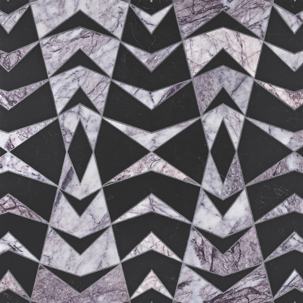 Inspired by an ornate chair in the lobby of the legendary Taj Mahal Palace Hotel, Mumbai Diamond’s strong, angular beauty presents South Asian decorative traditions through the lens of Art Deco, a design influence prevalent throughout the city. The mosaics come in two striking colorways: the rich and luxe Vanilla in Onyx and Thassos, and Black in Lilac and Nero marble.