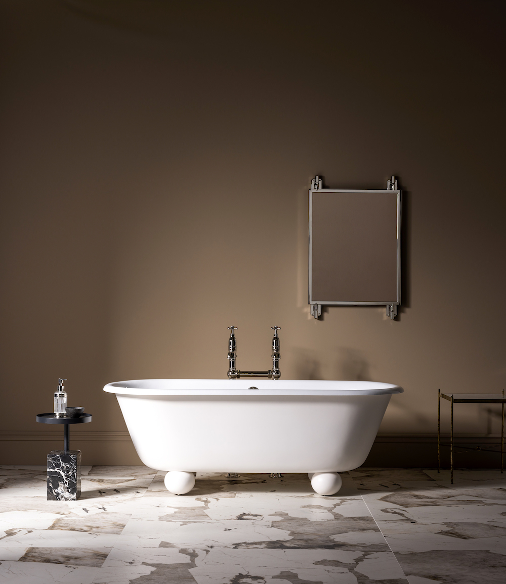 A rare new addition to Drummonds’ family of cast-iron bathtubs, the Newton is characterized by a visual ethereality and a playful nod to midcentury Scandinavian design. Generously rounded at the base, the bath’s body is subtly fluted to a broad rolled edge at the top, with proportions that feel ergonomic and organic. Upswept lines at the sides of the tub give a feeling of lightness that belies its solid cast-iron construction, seeming to float atop four oversized bun feet.