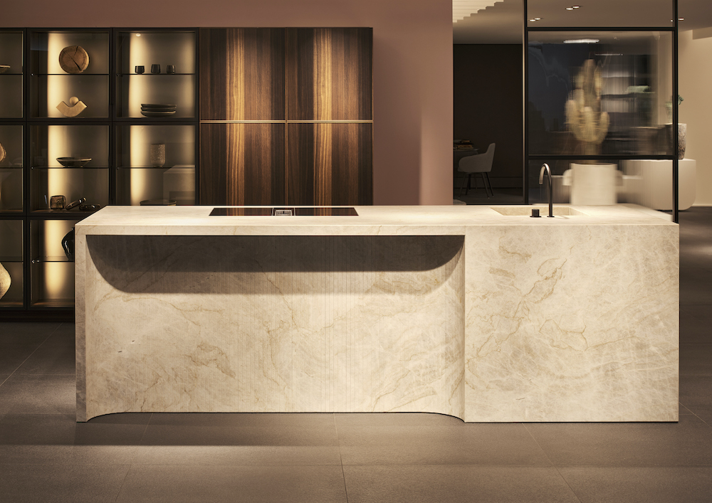 The sculptural +SEGMENTO kitchen island creates a surprising combination of two seemingly contradictory elements: the block-like nature of the body and its asymmetrical curves. Crafted from 100 minimally chamfered verticals, the oval is reminiscent of fluted columns.