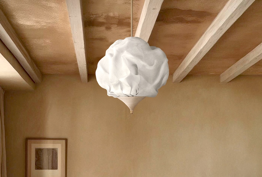 Hand-formed metal mesh shades are dimpled and folded into distinctive, artisanal forms. A modern design featuring a mesh shade supported atop a sculpted travertine base with brass finial.
