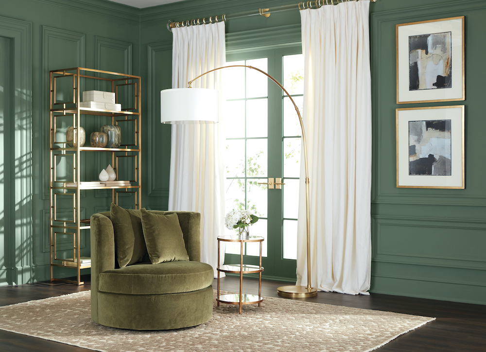 Available in three sizes, the Solenne swivel chair’s unique round profile can be customized in your favorite fabric. The Brielle bookcase, made from stainless steel and tempered glass, has Hollywood Regency influences.
