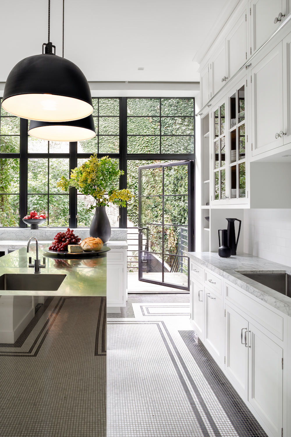 This historic Brooklyn brownstone kitchen – by Bilotta Kitchen & Home’s senior designer Aston Smith – features the brand’s private label cabinetry, the Bilotta Collection, with walnut interiors and a custom-made polished mirror, stainless steel island. Double stacked wall cabinets take full advantage of the tall ceiling height and a rolling, walnut library ladder (not shown in the picture) allows easy access.