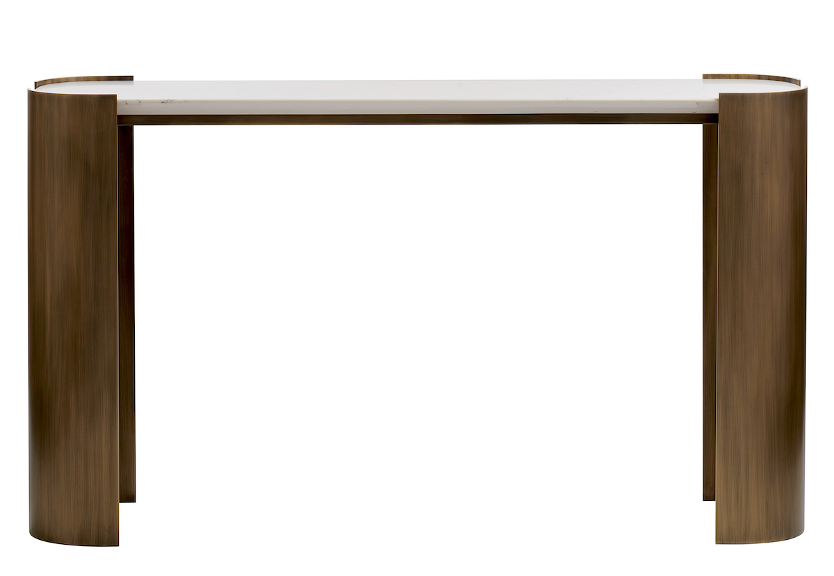 The Park Console by Powell & Bonnell has a pleasing oblong shape and four rounded frame legs. The reverse bezel on the top adds to the clean, sinuous lines. Tabletop options include lacquer, wood, natural stone, glass, or mirrored, and solid surfaces. The metal base can be powder coated or plated in a variety of finishes and colors.