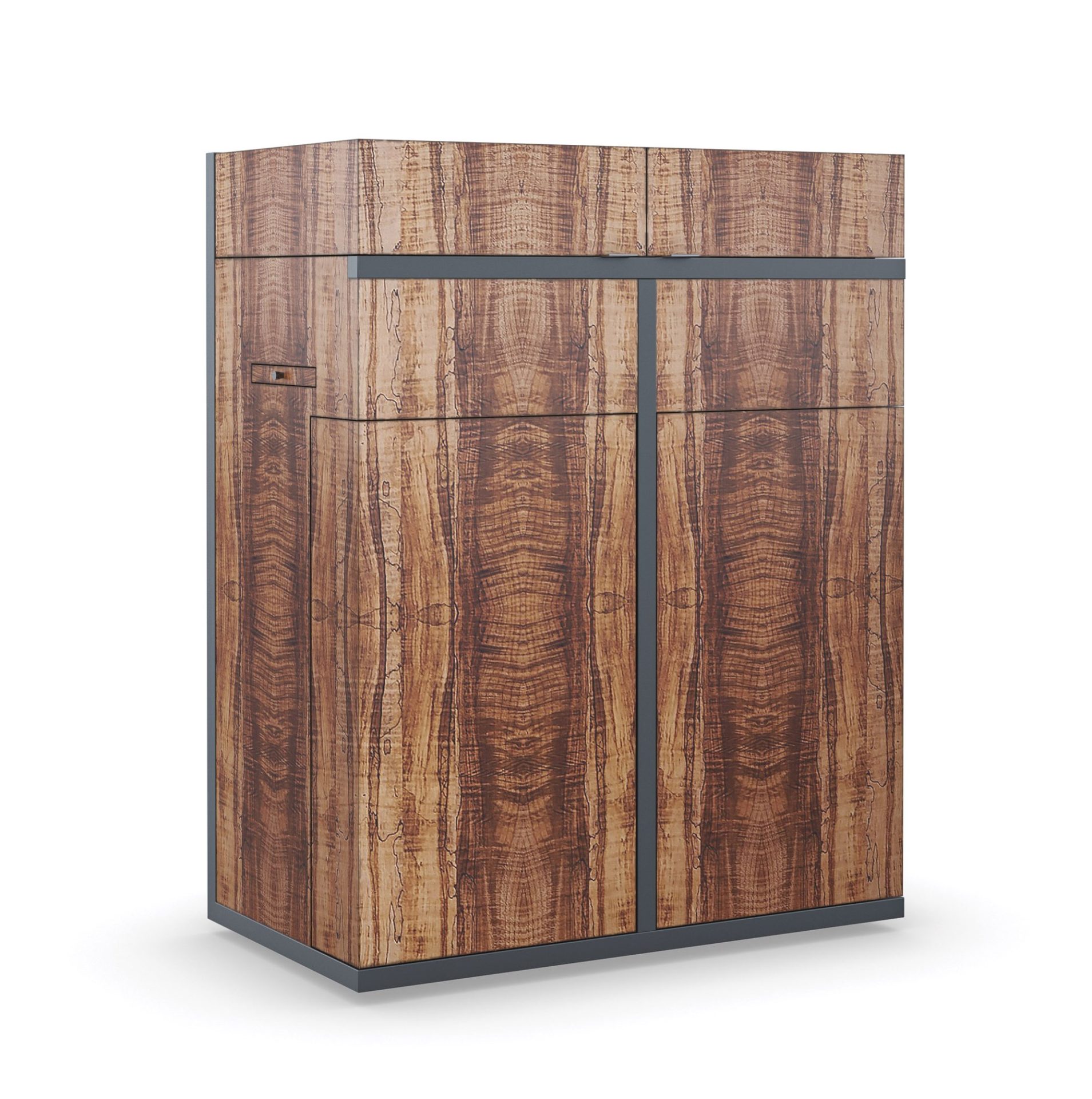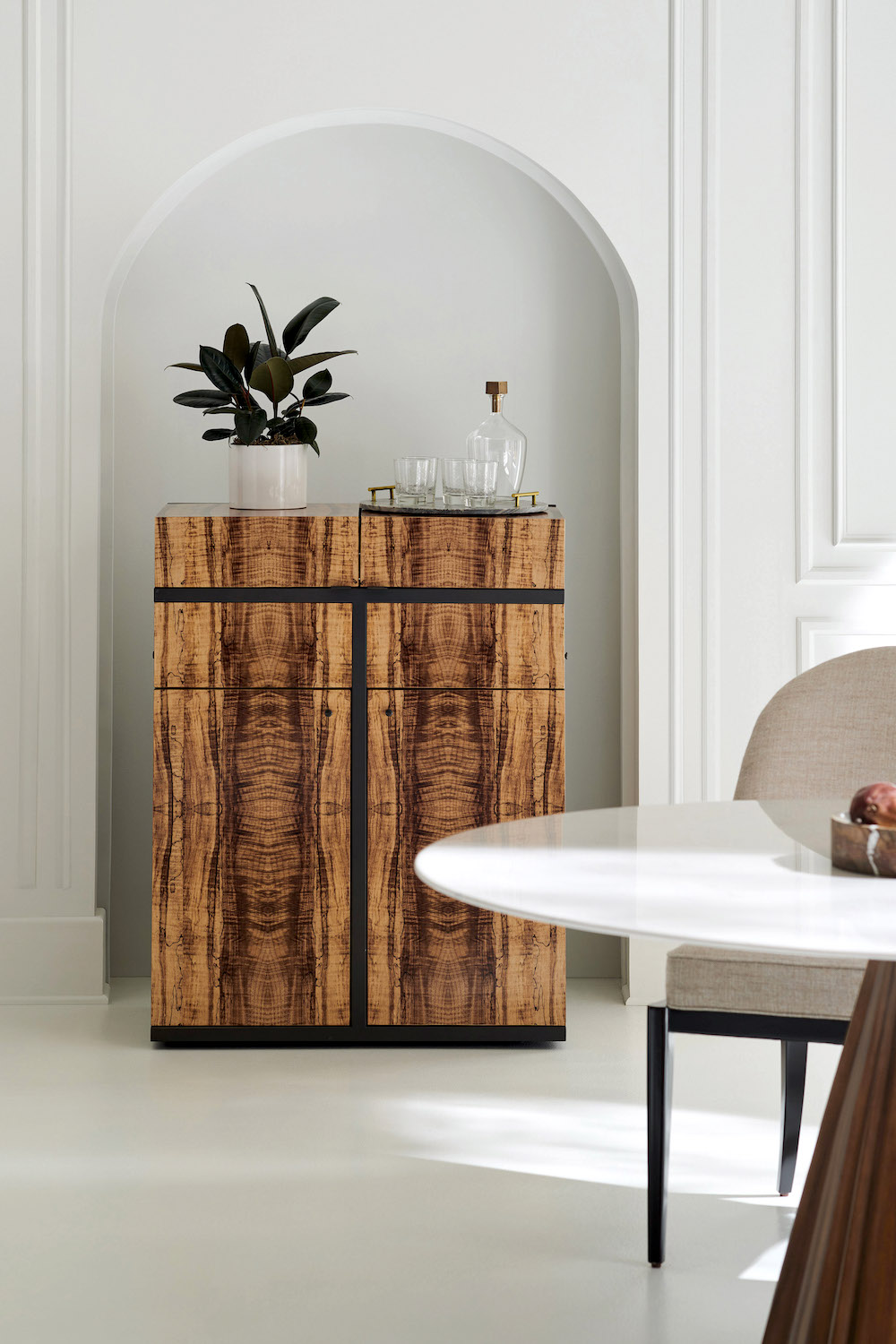 Luxury, understated: this sleek bar cabinet mixes form and function with innovation to elevate entertaining. Well- suited for compact spaces or larger living interiors, its clean-lined design accentuates the natural beauty of printed spalted maple. Features dual flip-top compartments that open to reveal storage with removable dividers, and pullout shelves on each side. Touch-latch doors with built-in shelves for bottles and glasses neatly conceal more storage space inside, while casters make it easy to move.