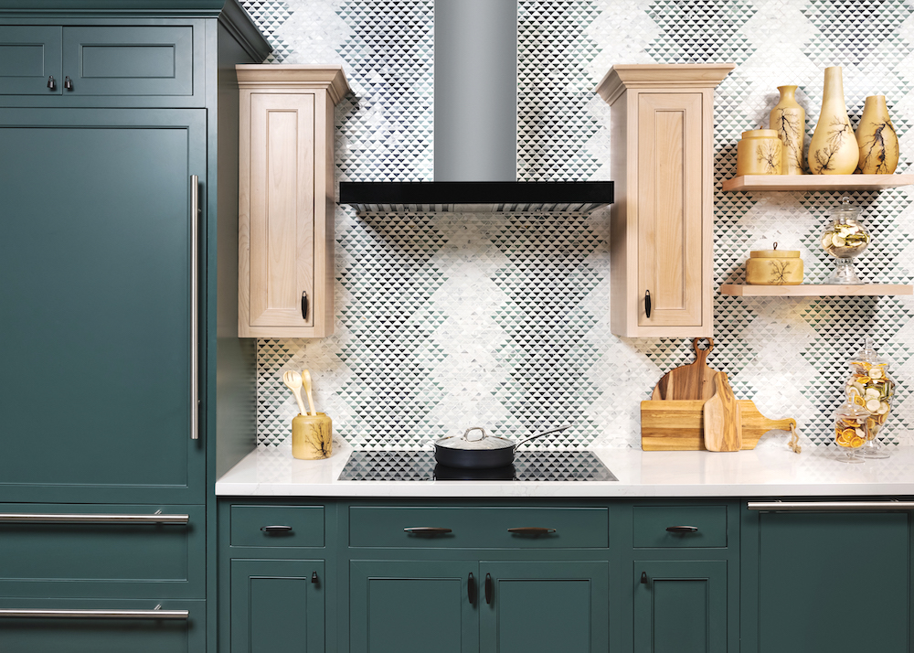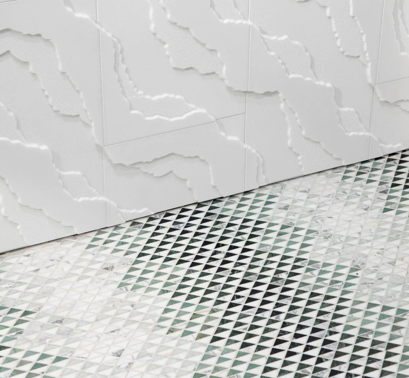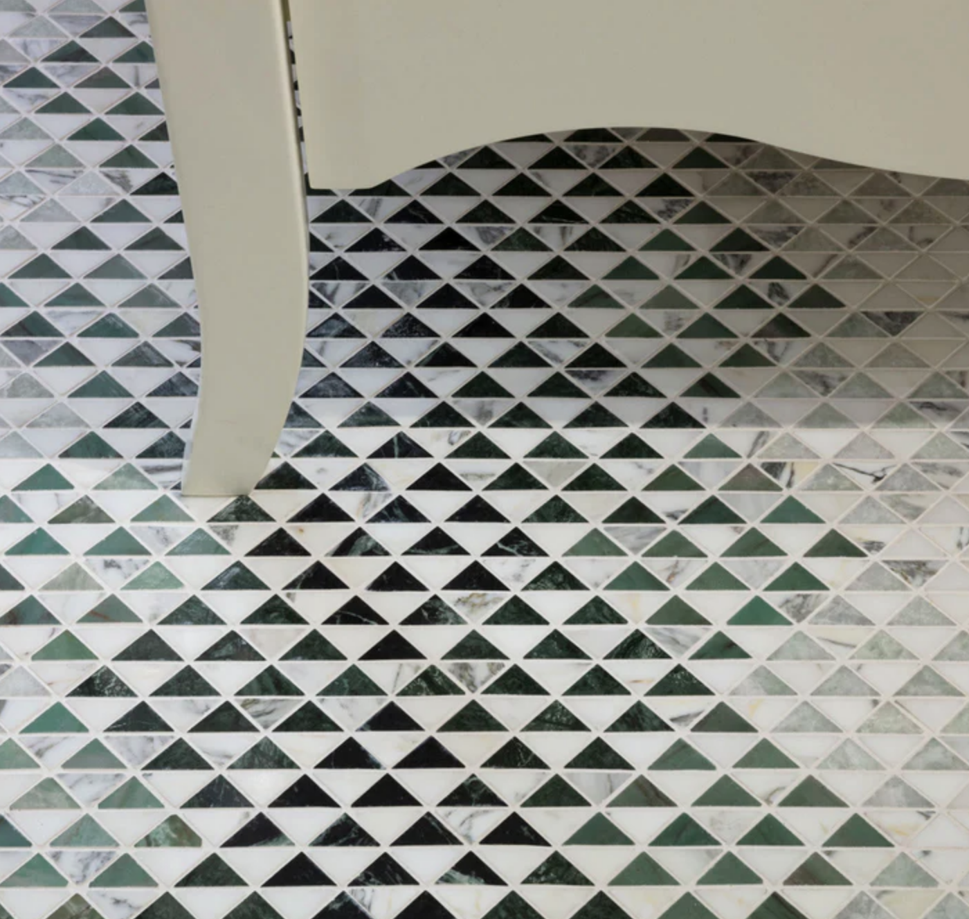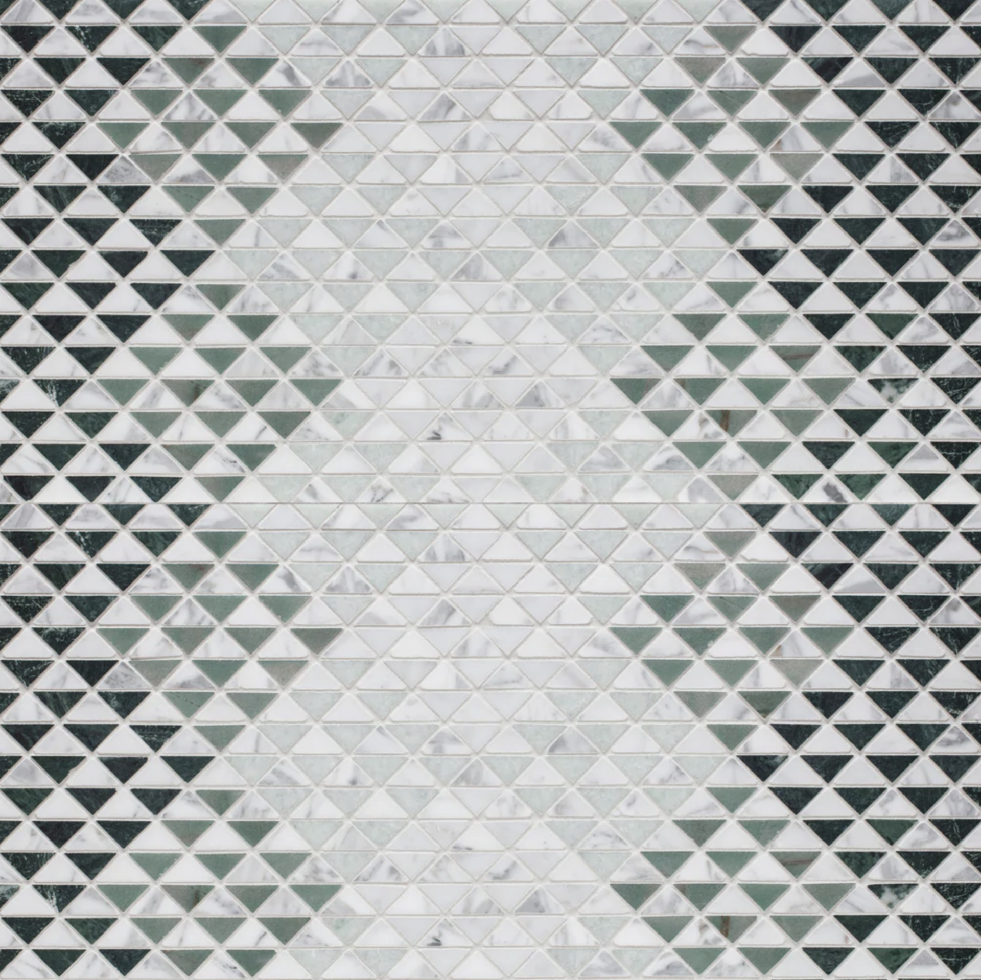 Drawing inspiration from the artful mosaics of Ancient Rome, the Triangolo collection renders classic marble species in contemporary geometric patterns. Pictured here in green.