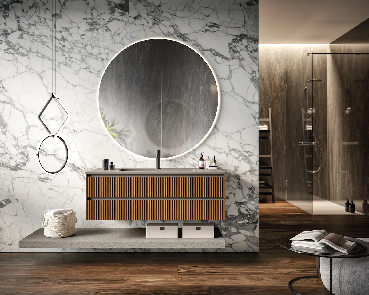 The Tricot modular vanity and storage collection from Hastings Tile & Bath features four distinct, fluted paneling sections. The series allows ample opportunity for customization of sizes, color, finish, and material, and also accommodates different sink styles. Additional wall storage units are also available.