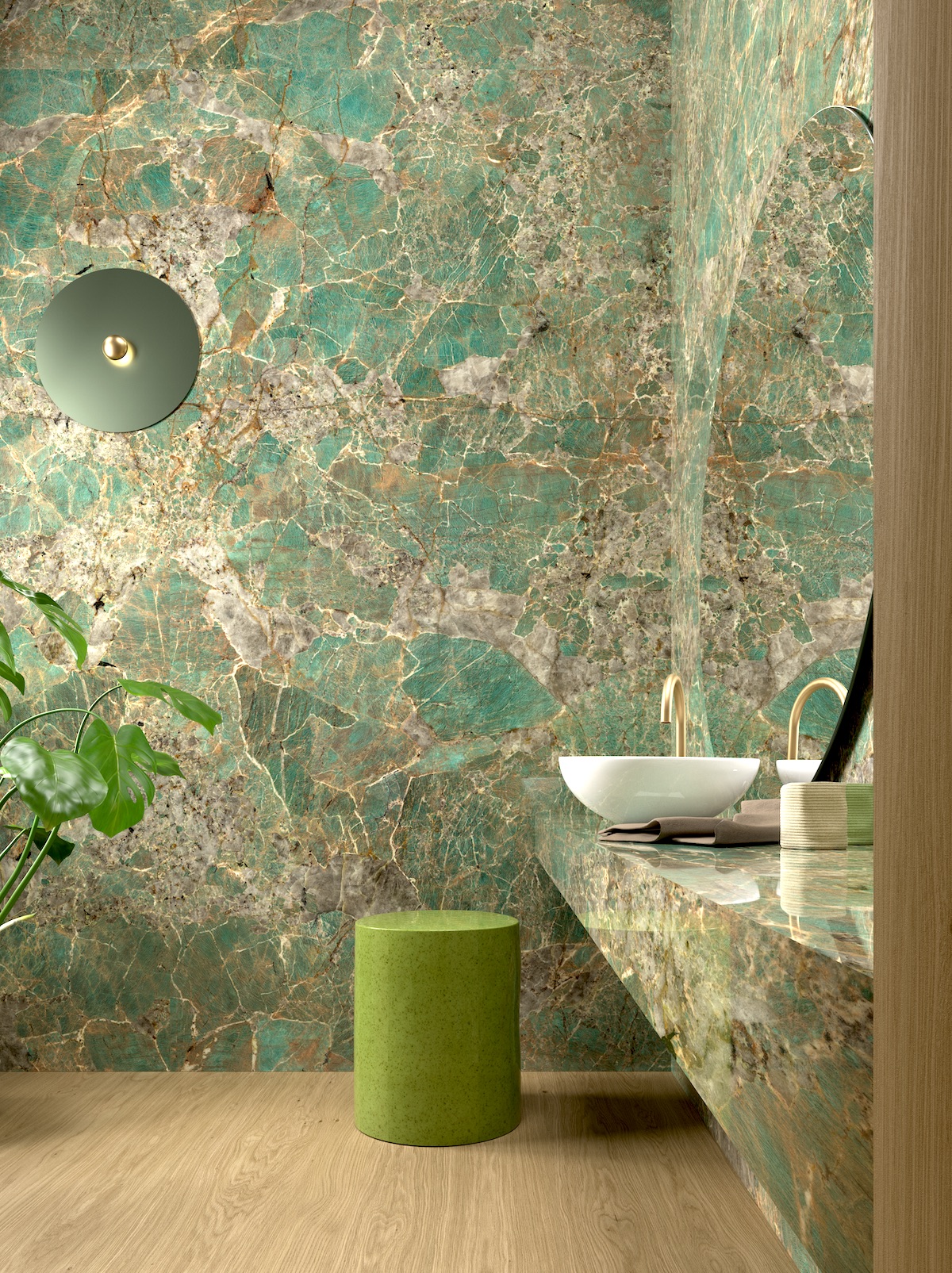 Xtone’s large format surfaces come in porcelain and natural stone. Amazonite comes in a polished finish, highlighting its turquoise, brown and grey tones. Through Porcelanosa.