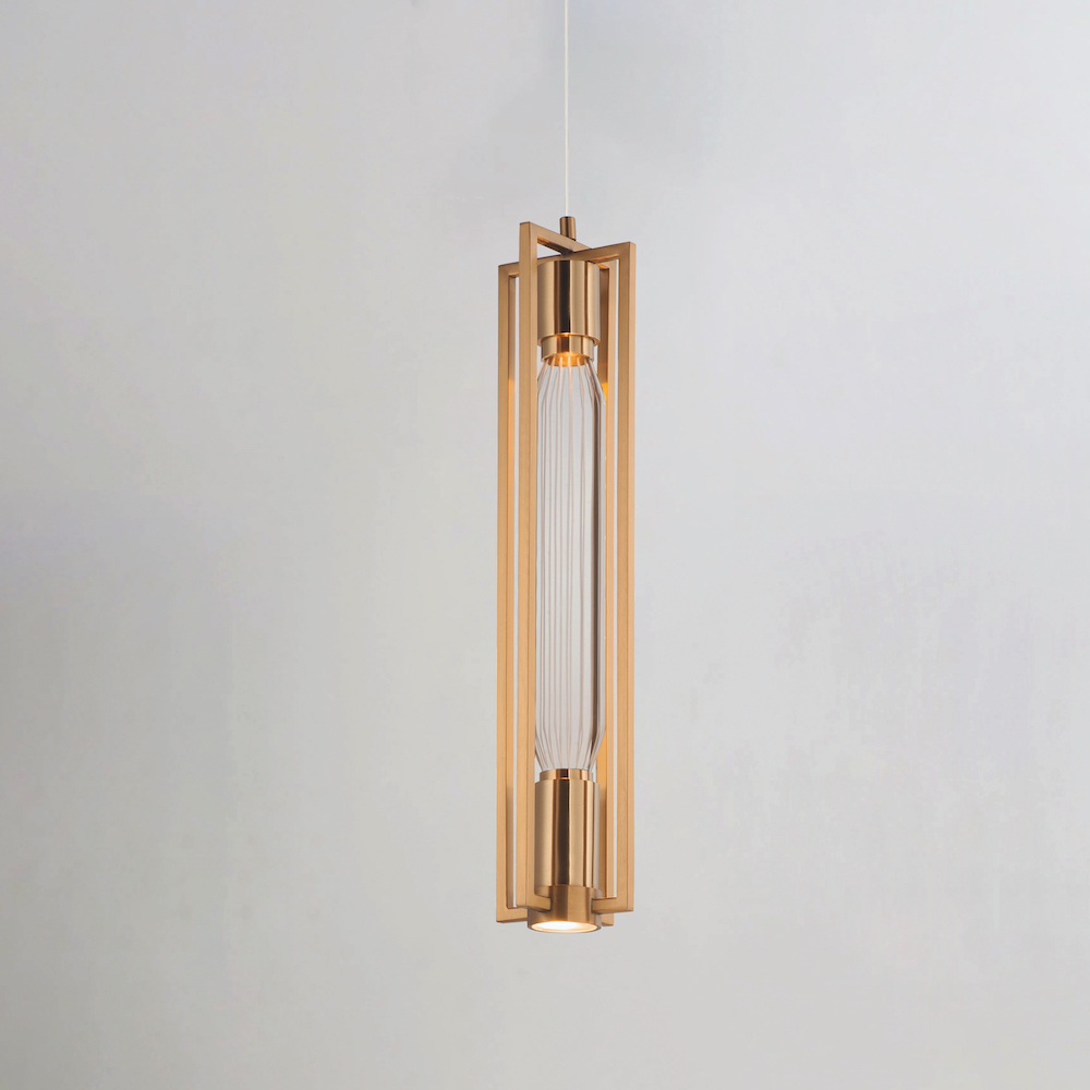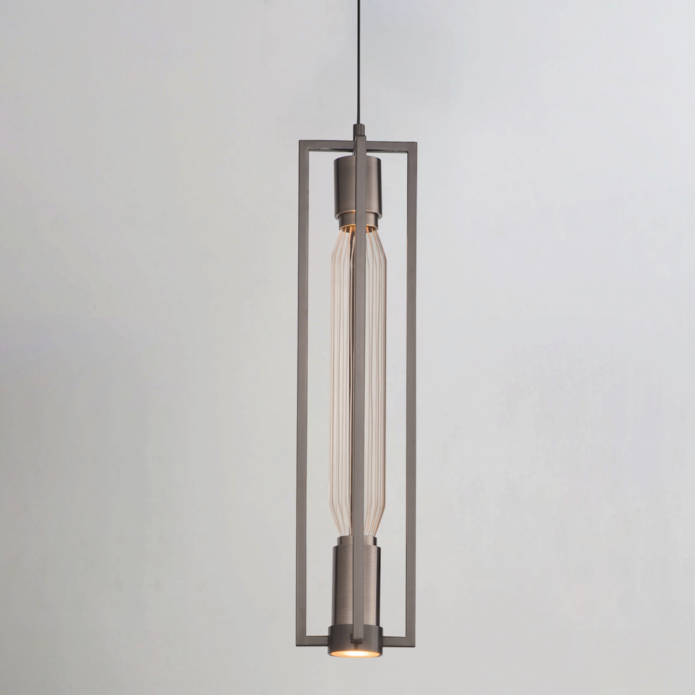 Encased in metal frames of Heritage Brass or Gunmetal, the Zeppelin series designed by Nina Magon showcases the airy shapes of precision cut glass. While concealed LED lamps highlight the precision cut details of the suspended glasswork, additional LED lighting is recessed within the frame to provide ample light downward.