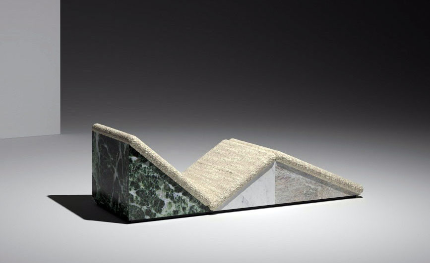 This lounge chair presents a radical and severe formal shape composed of juxtaposed triangular shapes. This apparently simple form is rendered possible through a complex inner structure that allows the production to use marble of an ecologically reasonable thickness.