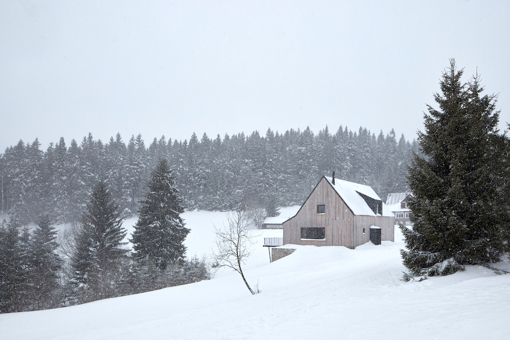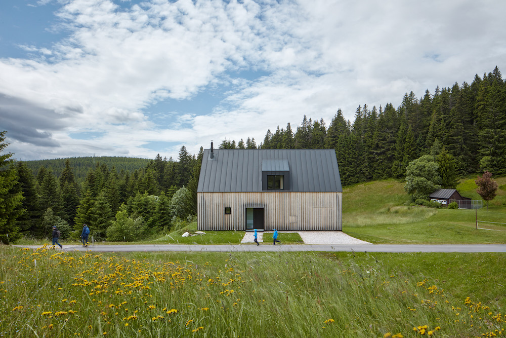 The house is positioned towards the western sloping mountain meadow of the boundary ridge, confirming local customs both in its distance from the road and alignment of the ridge. It echoes the shape of historical mountain houses while incorporating contemporary architectural principles.