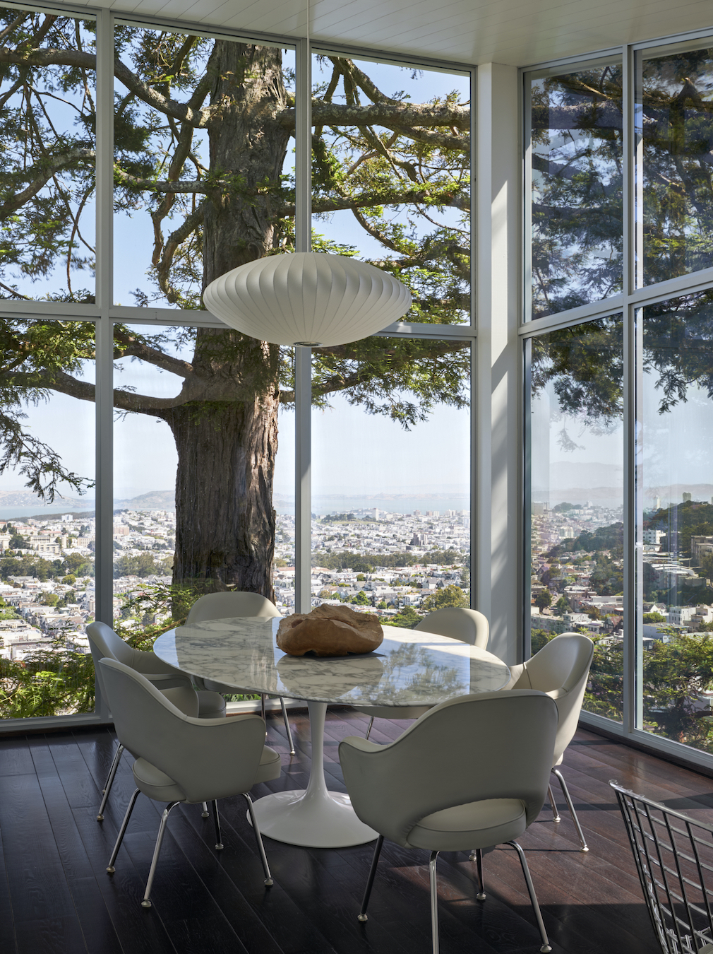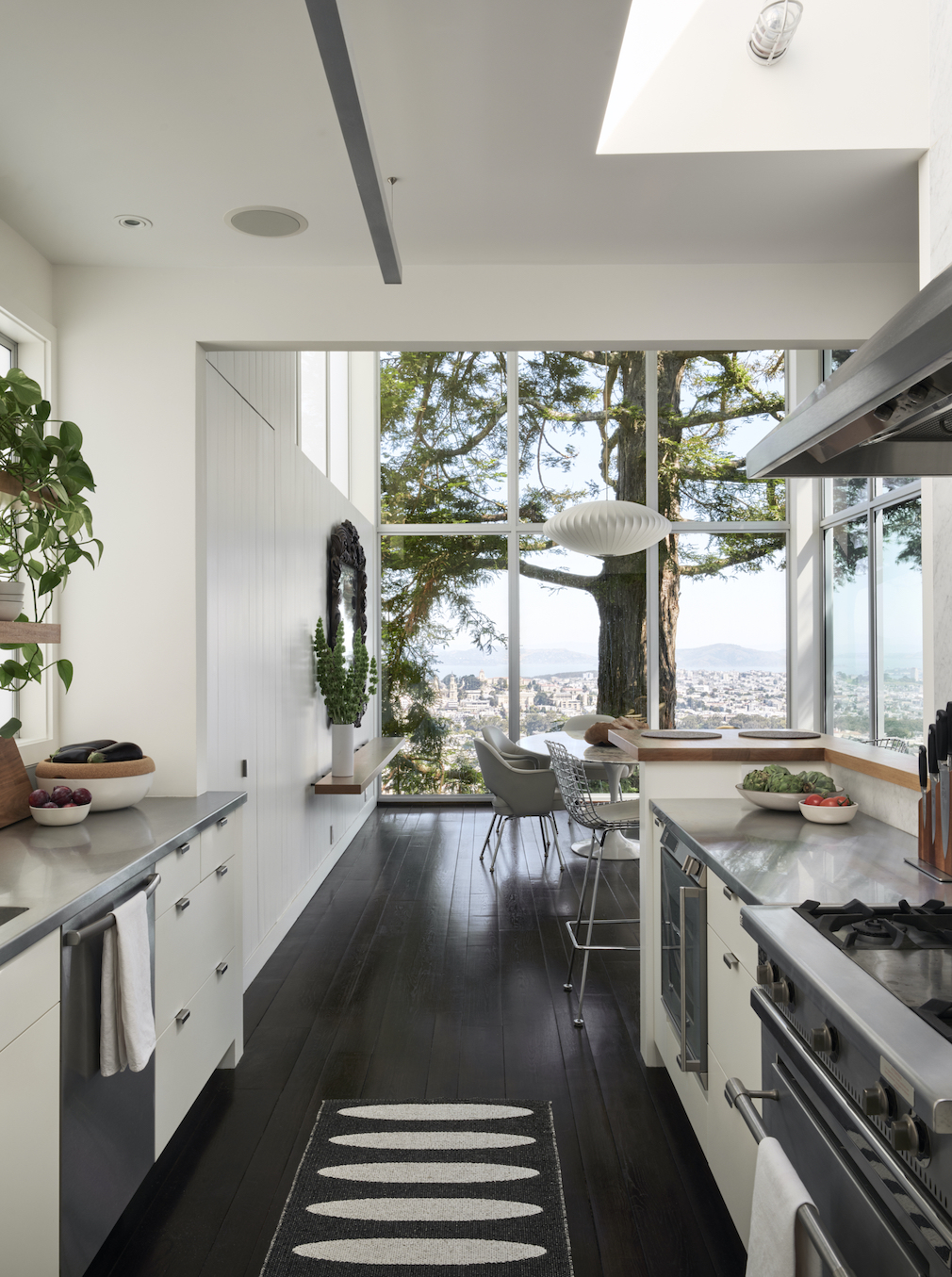Two decades after completion, this MDa Studios renovation continues to feel fresh, relevant, and intimately connected to its hillside setting, a testament to the firm’s enduring commitment to timeless design. Originally a modest ranch house perched on one of San Francisco’s many hills, the property’s most extraordinary asset, sweeping views of the Bay, had been left untapped. The MDa intervention reintroduced the home to the surrounding landscape, replacing a wall-bound entry and enclosed plan with newly framed vistas that connect rooms to one another and to the outdoors. Key moves included opening the entry to capture the view over a new stair to the added floor below, expanding the kitchen and dining area into a light-filled addition, and improving connection and visibility between spaces with thoughtful circulation.