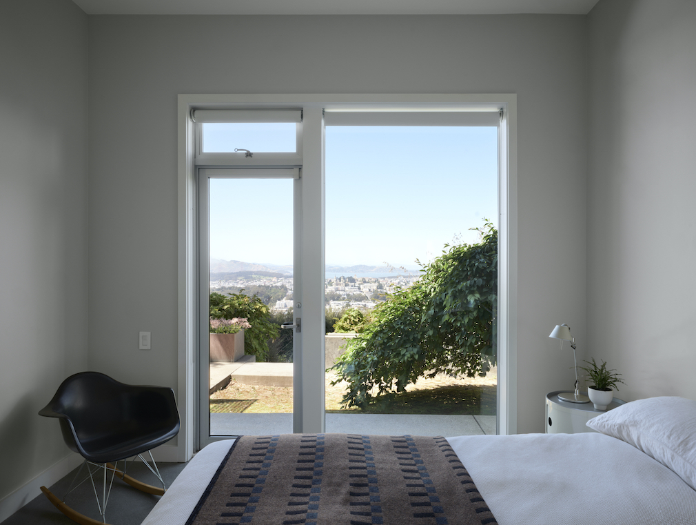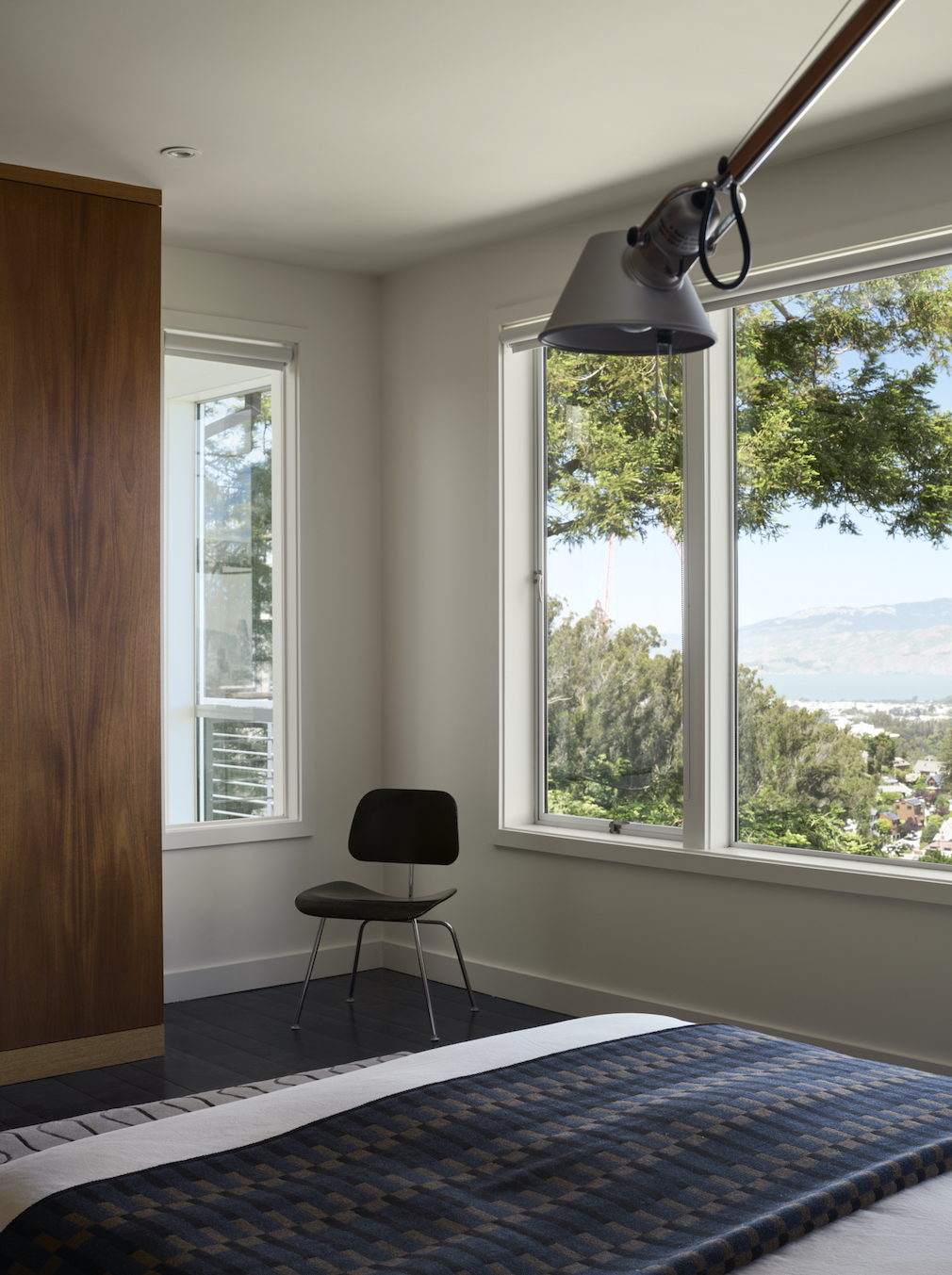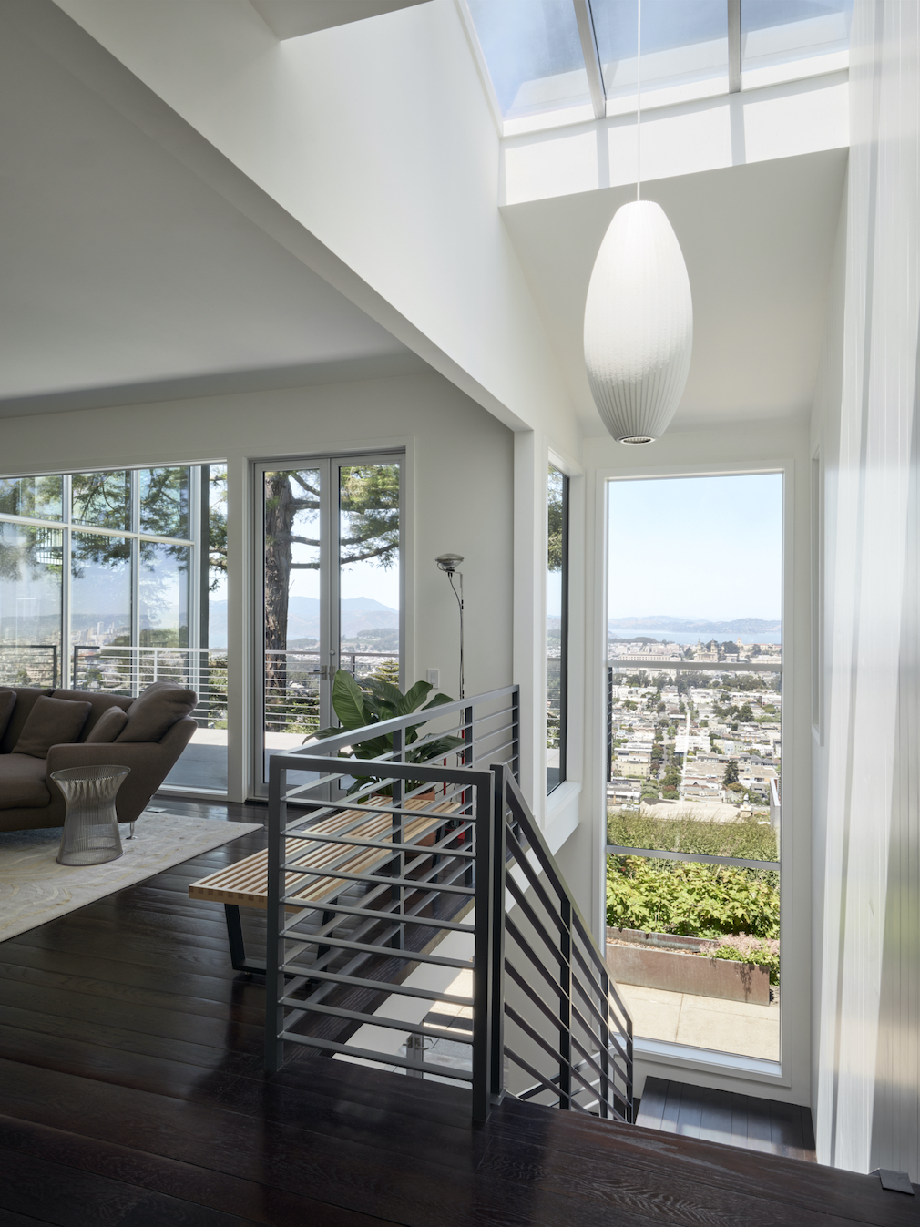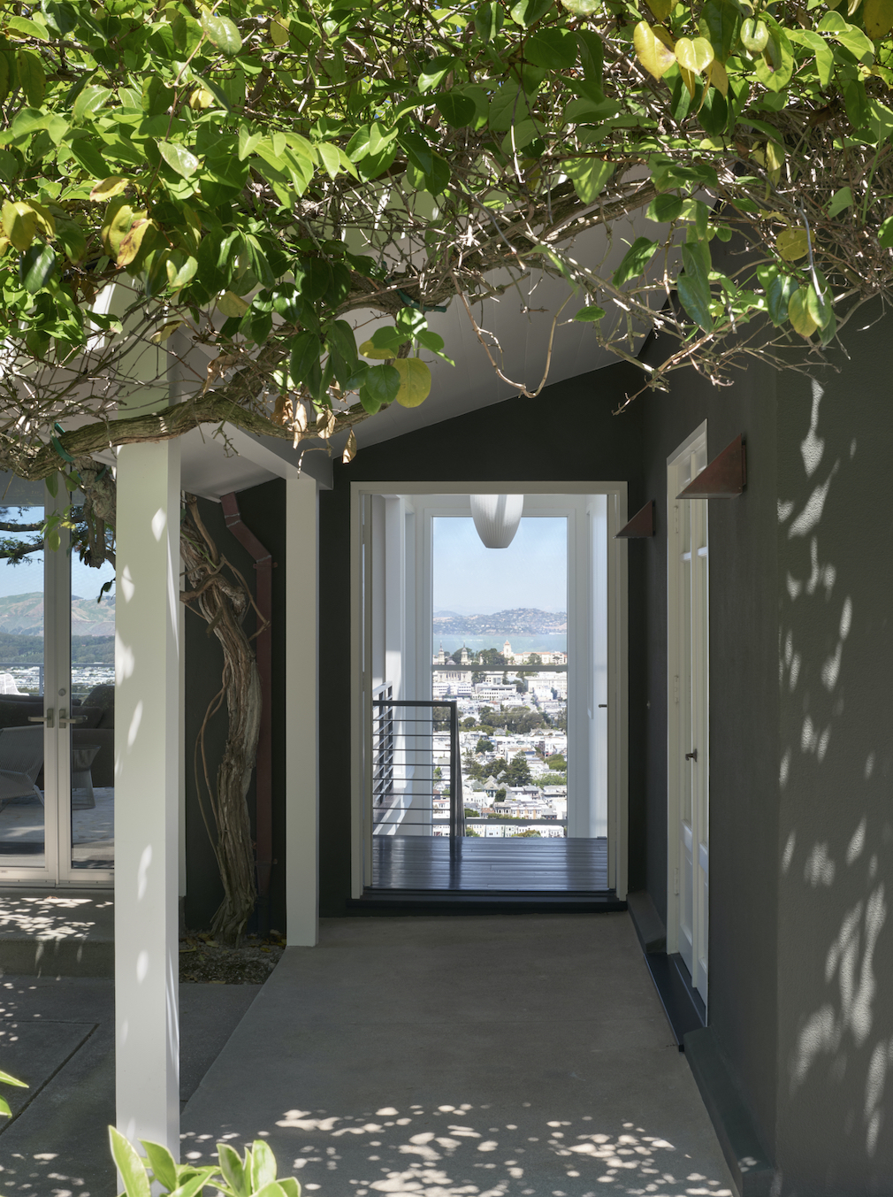 Signature MDa elements, including floor glass, interior windows, and strategic sightlines, were introduced to bring daylight deep into the house, highlight existing strengths of the original building, and preserve the sense of a grounded, cohesive home. A new primary suite and the new stair to the added floor below took over the footprint of a pair of small bedrooms that previously faced the views beyond. Those bedrooms were moved one floor down and still boast dramatic views thanks to the steeply sloping site, and the original viewless Primary Bedroom was transformed into a cozy guest suite with lovely French doors that open out onto a private entry courtyard.
