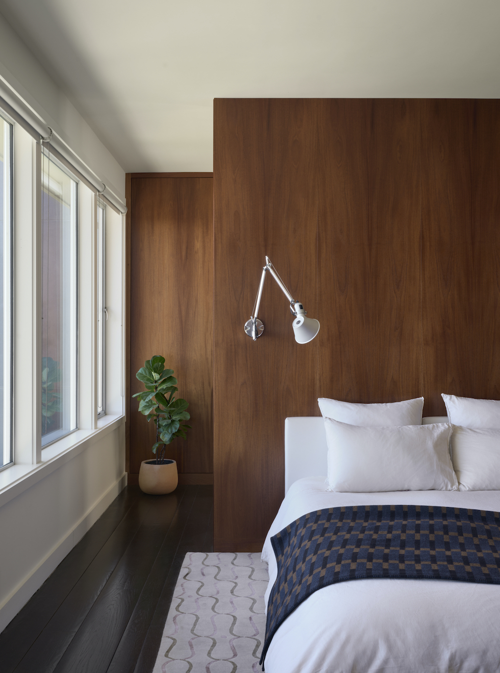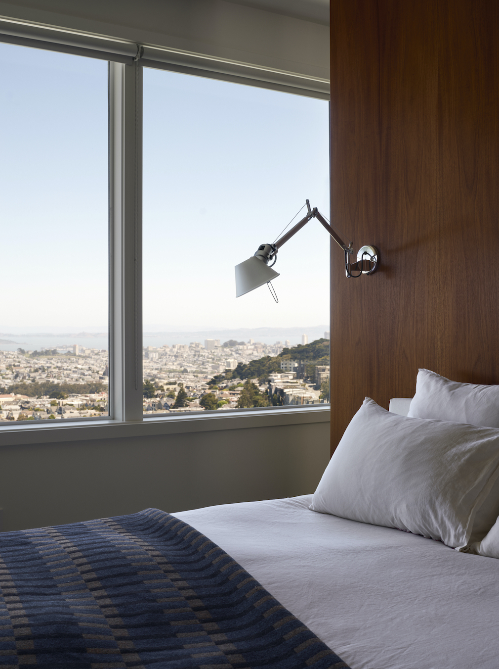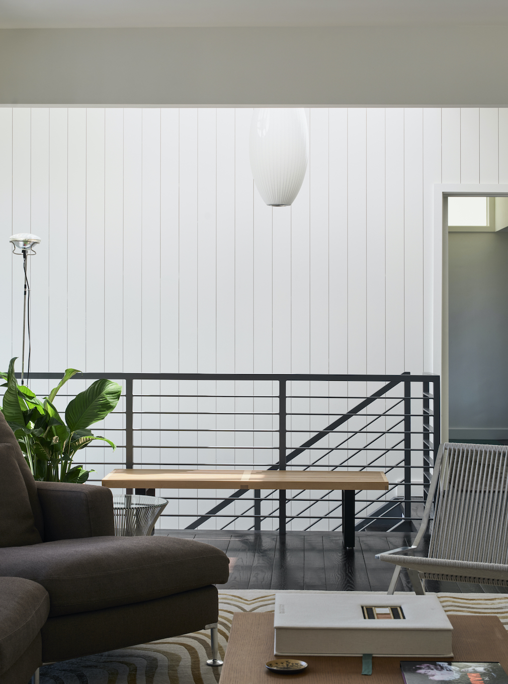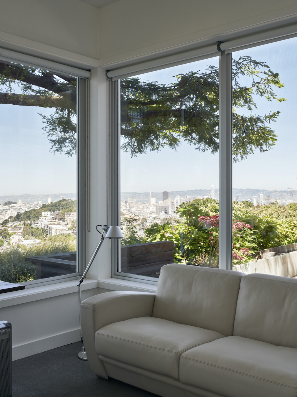 Signature MDa elements, including floor glass, interior windows, and strategic sightlines, were introduced to bring daylight deep into the house, highlight existing strengths of the original building, and preserve the sense of a grounded, cohesive home. A new primary suite and the new stair to the added floor below took over the footprint of a pair of small bedrooms that previously faced the views beyond. Those bedrooms were moved one floor down and still boast dramatic views thanks to the steeply sloping site, and the original viewless Primary Bedroom was transformed into a cozy guest suite with lovely French doors that open out onto a private entry courtyard.