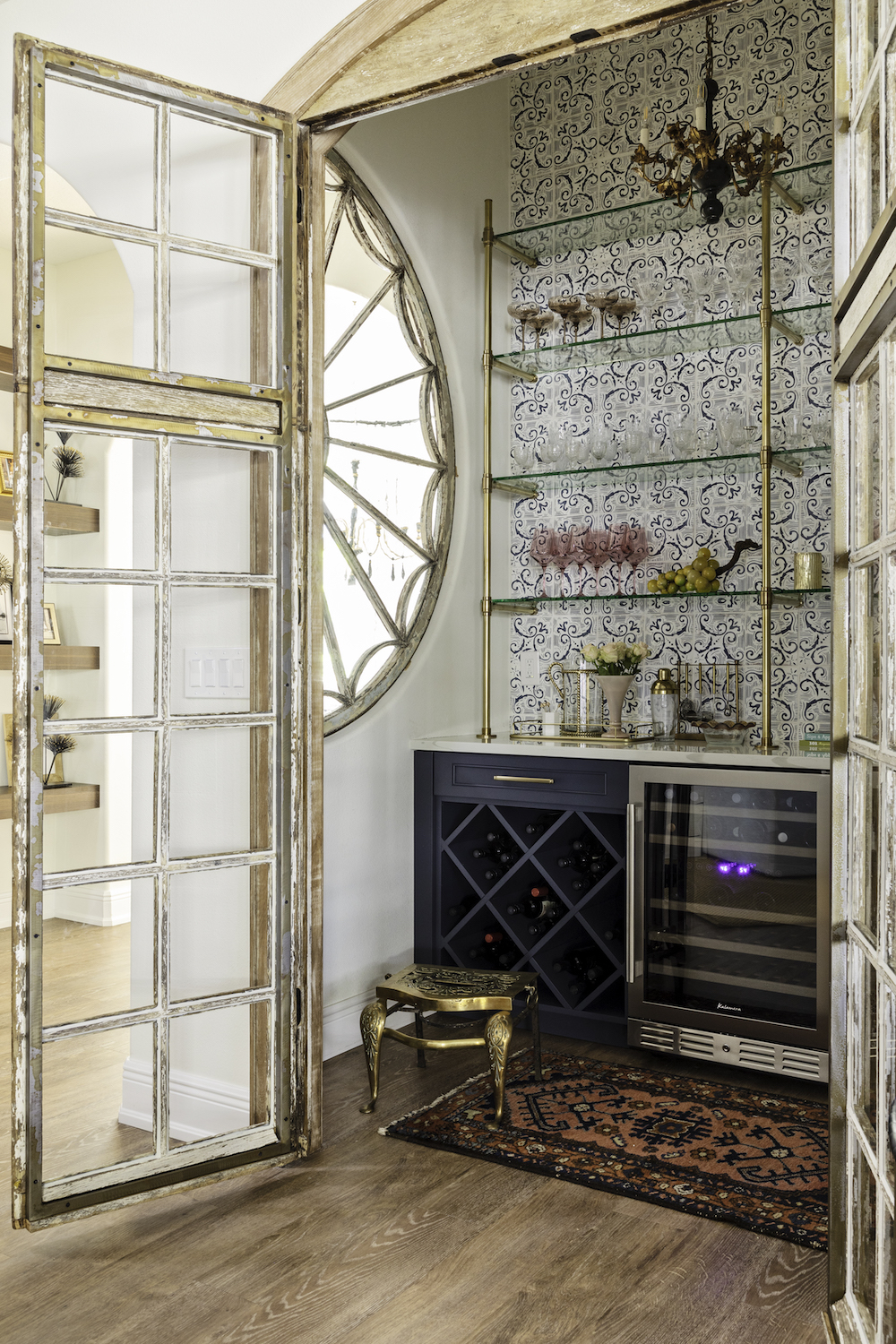 One of the home’s most magical spaces is the wine room, featuring the client’s antique, 300-year-old French doors, which evoke a sense of fanciful whimsy. “She had the doors leaning against the wall in her dining room as art, and she didn’t know what to do with them. So we made them a focal point.”