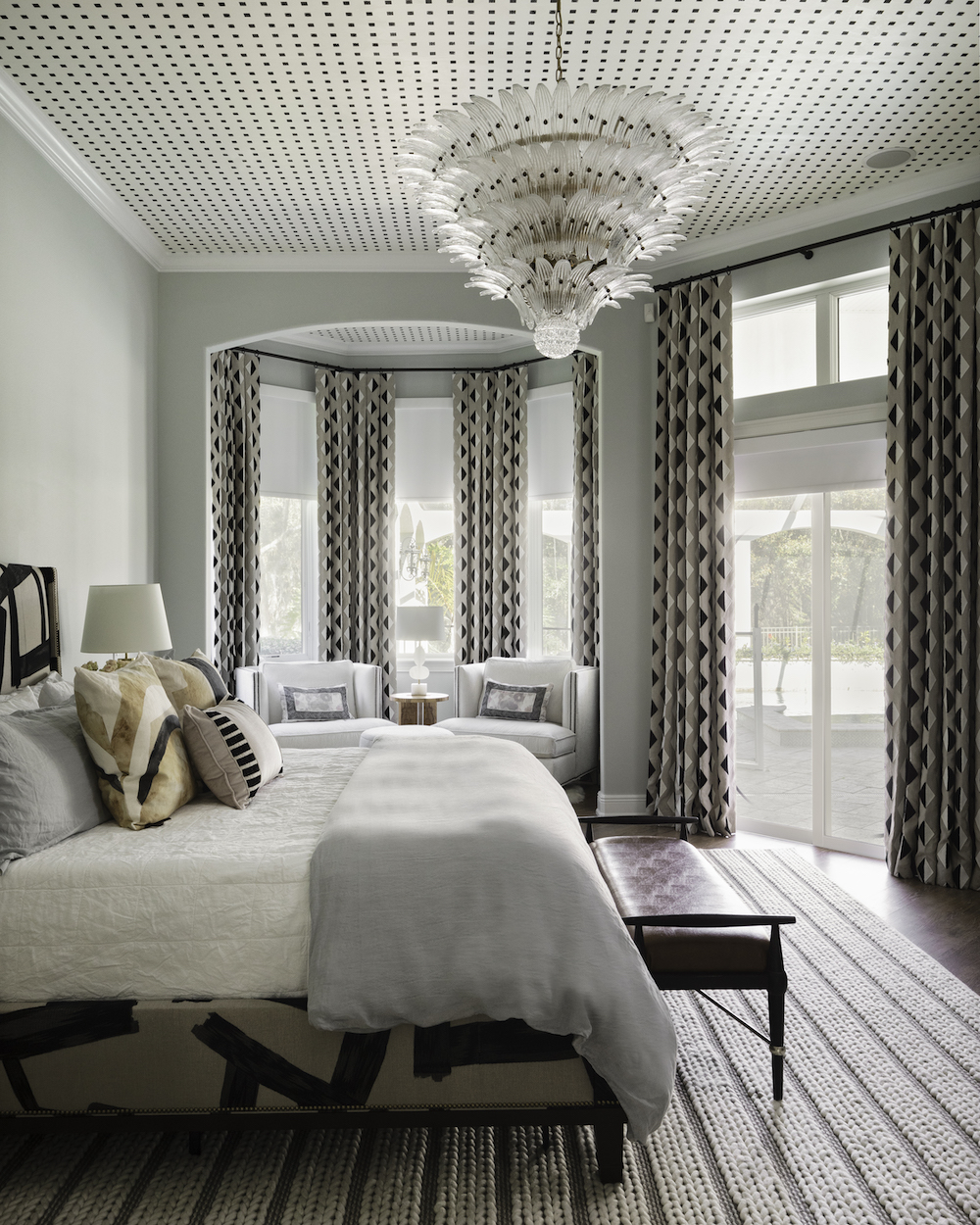 The primary suite in this Mediterranean home has layers upon layers of texture, from the custom, cotton-braided rug to the geometric drapes displaying two-dimensional crewelwork embroidery to the bed swathed in Pierre Frey fabric with a delicate hidden detail.
