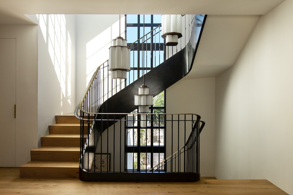 Throughout the project, Medium Plenty focused on balancing traditional and modern styles, spatial needs, and the project site. One of the most notable features of the project is the central staircase, which acts as both the centerpiece and spine of the residence. A three-story, continuous ribbon window accentuates the staircase verticality and provides continuous natural light. The result is a stunning, sculptural feature that provides a dramatic focal point for the interiors by Regan Baker Design.