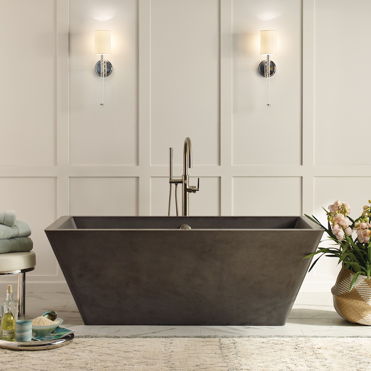 A masterful blend of contemporary innovation with rustic sensibilities characterizes the new Mendocino NativeStone Freestanding Tub from Native Trails. Its slanted sides and deep interior make it a captivating presence in any bathroom. The tub’s thick walls provide insulation to ensure that a hot, deep, relaxing soak will last and last. Using a sustainable blend of natural jute fiber and cement that showcases its organic beauty and luxurious silky-smooth texture, this eco-friendly concrete tub is exceptional in its lighter weight, one-of-a-kind coloration, and extraordinary stain, scratch, and crack resistance.