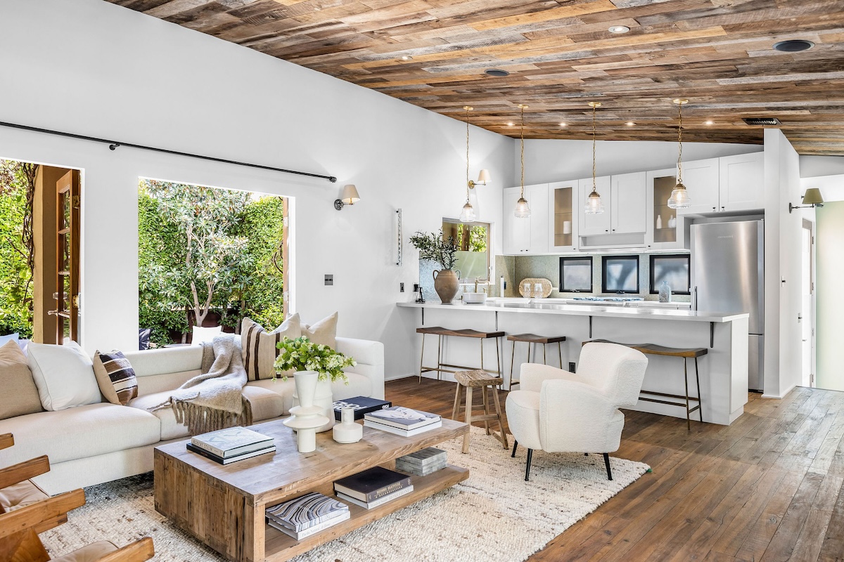 The bungalow’s coastal California vibe is characterized by vaulted ceilings clad in reclaimed wood, a combination of smooth concrete and wide plank wood flooring, and an effortless indoor-outdoor connection achieved via retractable window walls and glass doors. Some of Bradley Cooper’s own furnishings were used for the staging, including the center island bar stools. “The goal was to blend our Meridith Baer inventory to what Bradley already had in the house,” Baer said. “We wanted it to feel welcoming and warm.”