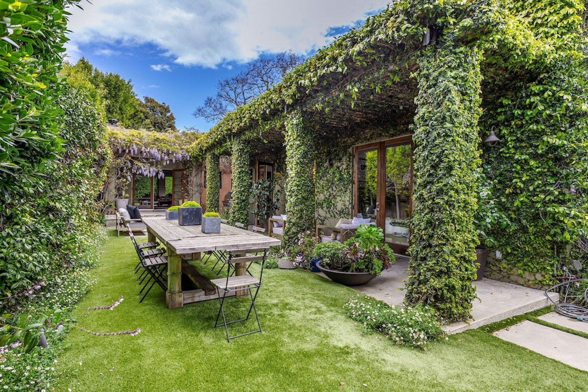 Many areas in the two bedroom layout overlook sumptuous views of the private backyard featuring a vine-covered pergola, fire pit, built-in barbecue, hot tub and sheltered areas for dining and lounging. “The house sits behind beautiful hedges and feels like you are in a private oasis,” Baer commented, an aspect of the home the actor appreciated during his downtime.