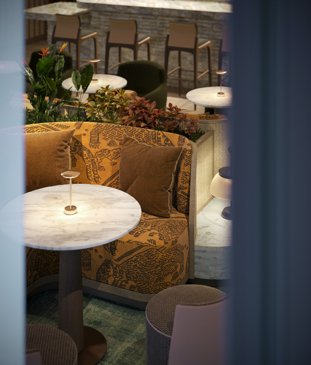 The speakeasy, FiftyThree, will experiment with bold colors and patterns, embracing a whiskey-themed palate. Darker browns and greens will set a more intimate mood, featuring bronze fixtures and accents creating the perfect nighttime setting. The cocktails will also embody a more playful aesthetic, while focusing on fresh ingredients and creative curations.