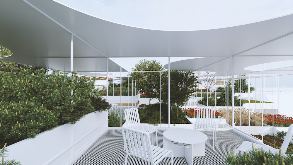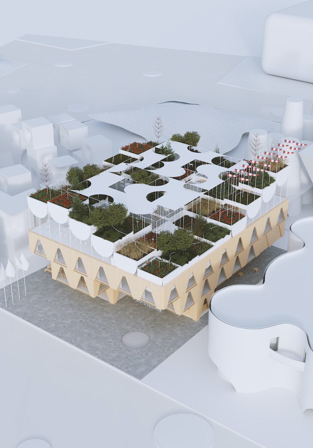 Mjölk architekti’s design proposal for the pavilion of the Czech Republic at the Universal World EXPO 2025 in Osaka, represents the Czech Republic as a cultivated garden that provides people with a place to exercise their immeasurable talent and creativity. Based on the idea of a garden in the sky, the welcoming wooden pavilion represents a cloud, hovering over the heads of visitors who are drawn into the heights of a roof garden. It houses an exhibition that combines historical materials and instruments representing a quest to understand natural phenomena with technological and environmental visions on the theme of landscape care and sustainability, along with works of a number of Czech creatives.