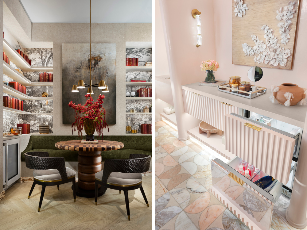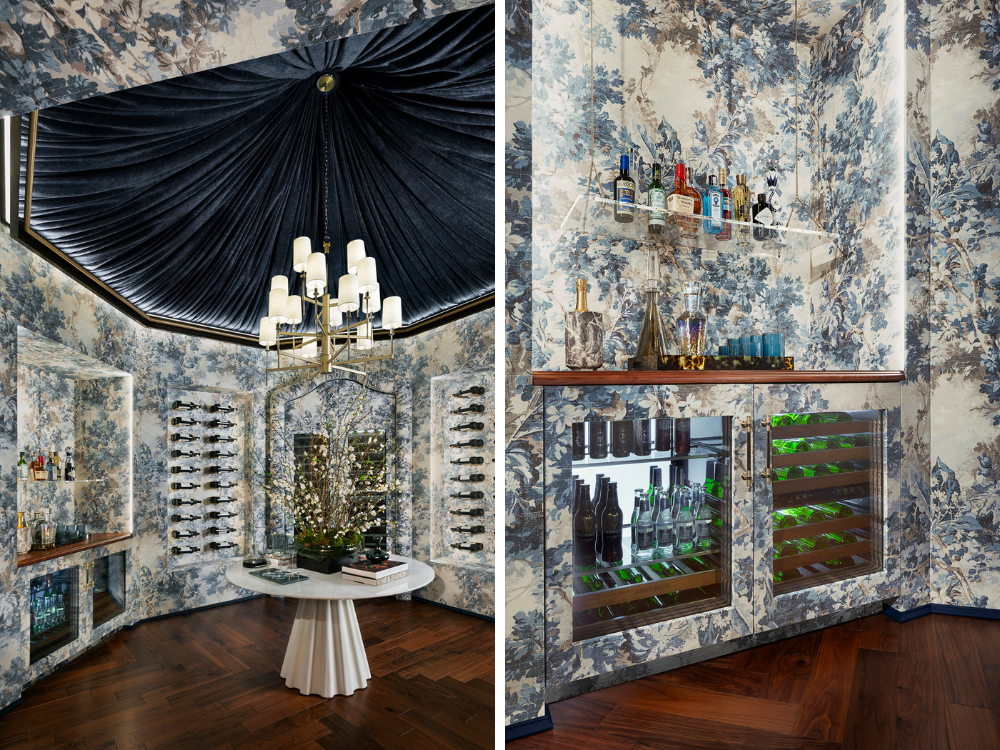 One of Burns’ favorite moments was the installation’s blush-tinged bathroom, which she says was an “unexpected design for Monogram to showcase spa-like amenities at home with refrigerator drawers for items such as skincare serums and sparking water.” Meanwhile, a dramatically paneled, library-inspired wine showcased the 24-inch Panel-Ready Wine Column, 24-inch Undercounter Wine Reserve, 24-inch Undercounter Beverage Center, as well as an integrated dishwasher.