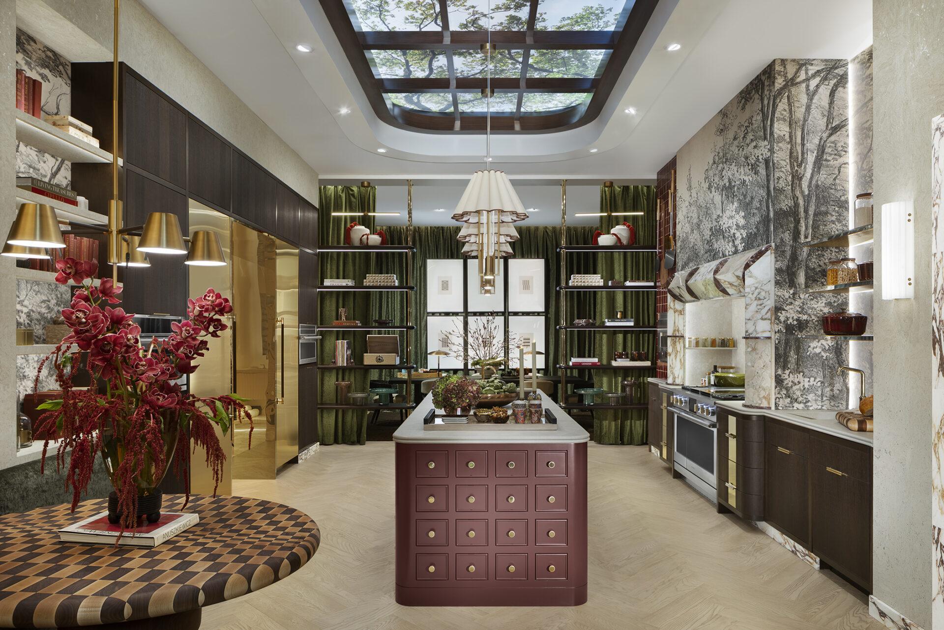 One of Burns’ favorite moments was the installation’s blush-tinged bathroom, which she says was an “unexpected design for Monogram to showcase spa-like amenities at home with refrigerator drawers for items such as skincare serums and sparking water.” Meanwhile, a dramatically paneled, library-inspired wine showcased the 24-inch Panel-Ready Wine Column, 24-inch Undercounter Wine Reserve, 24-inch Undercounter Beverage Center, as well as an integrated dishwasher.