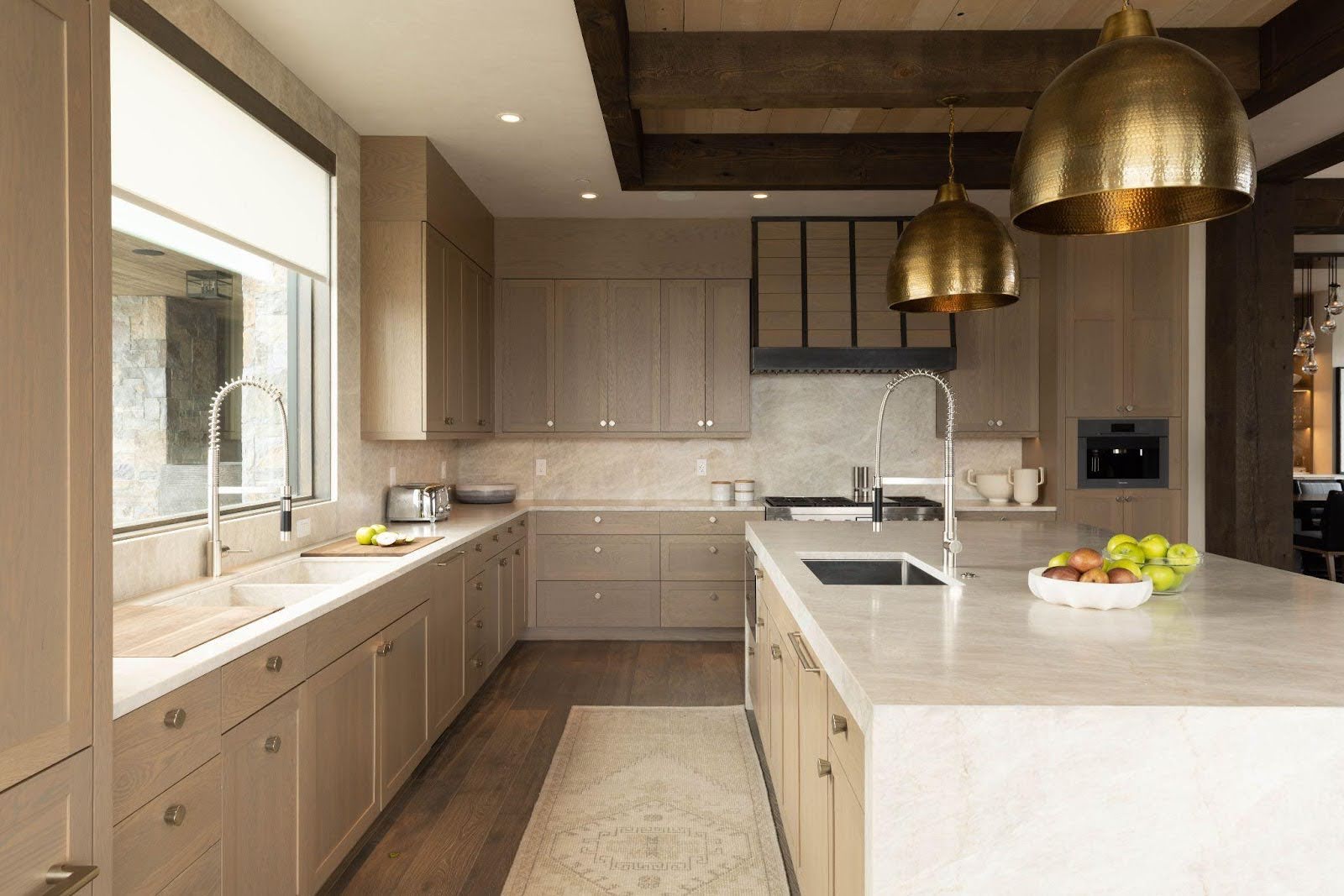 The kitchen, which features custom rift-cut oak cabinetry, Taj Mahal Quartzite countertops in a leathered finish, and a full suite of Subzero Wolf appliances, epitomizes this harmony of design. “The kitchen is a true cook’s haven,” notes Treasure, highlighting its spacious design and thoughtful details like the abundance of integrated storage throughout.