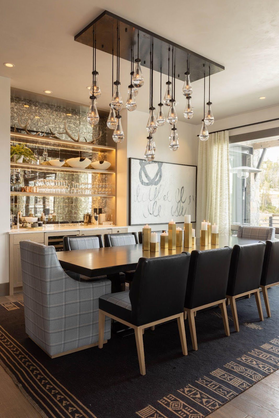 In the dining area, a Pearl chandelier from Restoration Hardware provides a touch of decadence, while antique mirror panels in the bar’s backsplash create an illusion of added space.