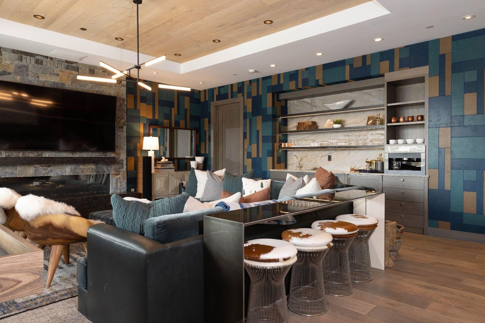 The adjacent recreation room is a bold departure, featuring a Rubik geometric teal and gold wallpaper and custom woolen plaid upholstery. “We knew the clients would be open to something adventurous here,” says Treasure. “It’s a space designed to bring people together for ping pong, movies, or just relaxing.”