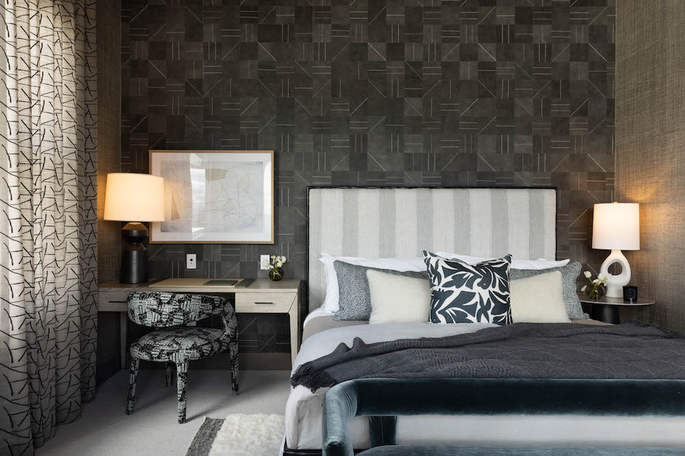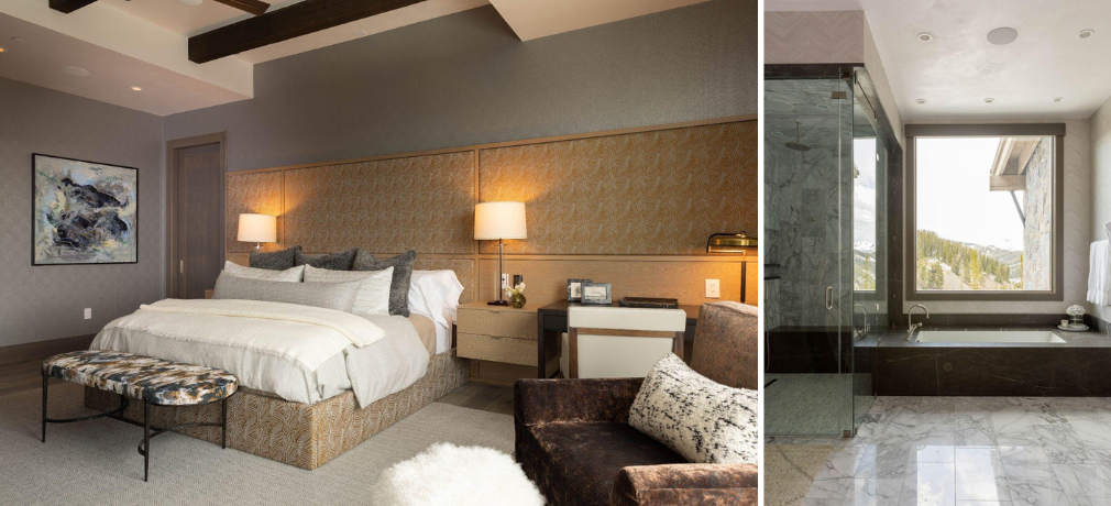 The primary suite provides a serene escape, with a custom fabric-wrapped headboard in Jiun Ho’s Seronera upholstery, integrated side tables, and a functional desk for the husband’s work needs. The spa-like bathroom, clad in veined ecru marble with black accents, features a standalone black marble tub perfectly positioned with a viewfinder window that takes the landscape and presents it as if it is a framed artwork.