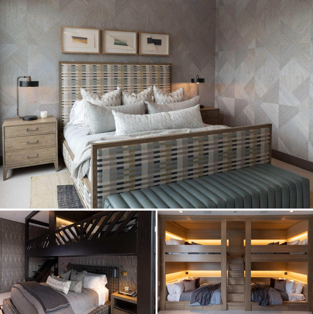 Guest accommodations were tailored to the client’s family dynamics, with two bunk bed rooms for grandchildren and three additional guest rooms for adults. The bunk rooms — playful yet sophisticated — were custom-designed and milled to evoke a “sleepover” vibe while maintaining Alder & Tweed’s signature elegance. Speciality wallpapers by Holly Hunt feature subtle geometric patterns that add depth and texture to the bedrooms.