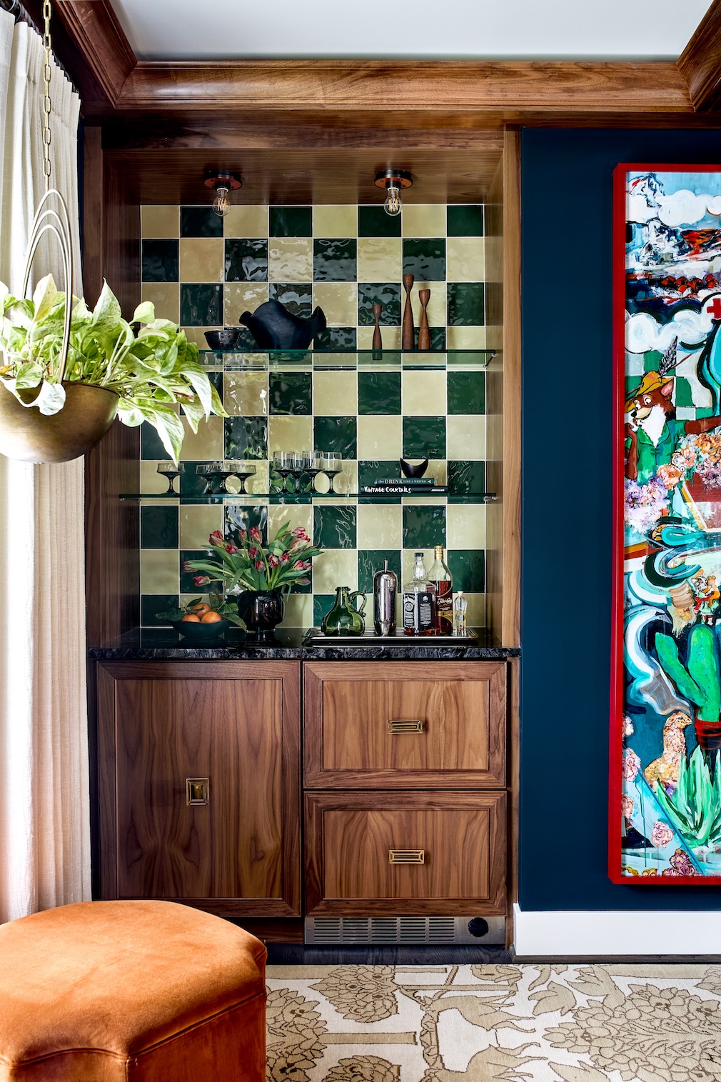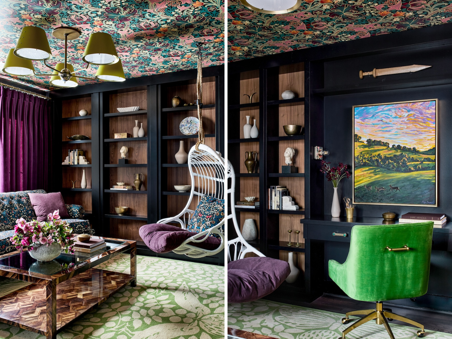 What was once a spare, unused guest bedroom became a parlor and office retreat. A beautiful, eclectic House of Hackney wallpaper adorns the ceiling while custom built-ins with walnut backing provide a reader’s haven. Custom Emily Dwan artwork depicts the owner’s favorite landscape from back home, adding a beautiful personal touch to a wonderfully vibrant space. High-end, custom-finished lighting in various areas throughout the dark and moody space provides a variety of lighting options for the space’s multiple uses. The furniture, including a Made Goods coffee table and Serena & Lily chair, rest on a custom-designed, hand-knotted, and hand-tufted silk and wool rug from artisans in Nepal. This room is accessible only via a private, hidden entrance off of the primary suite, offering a much-needed retreat from daily life.