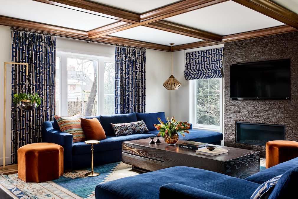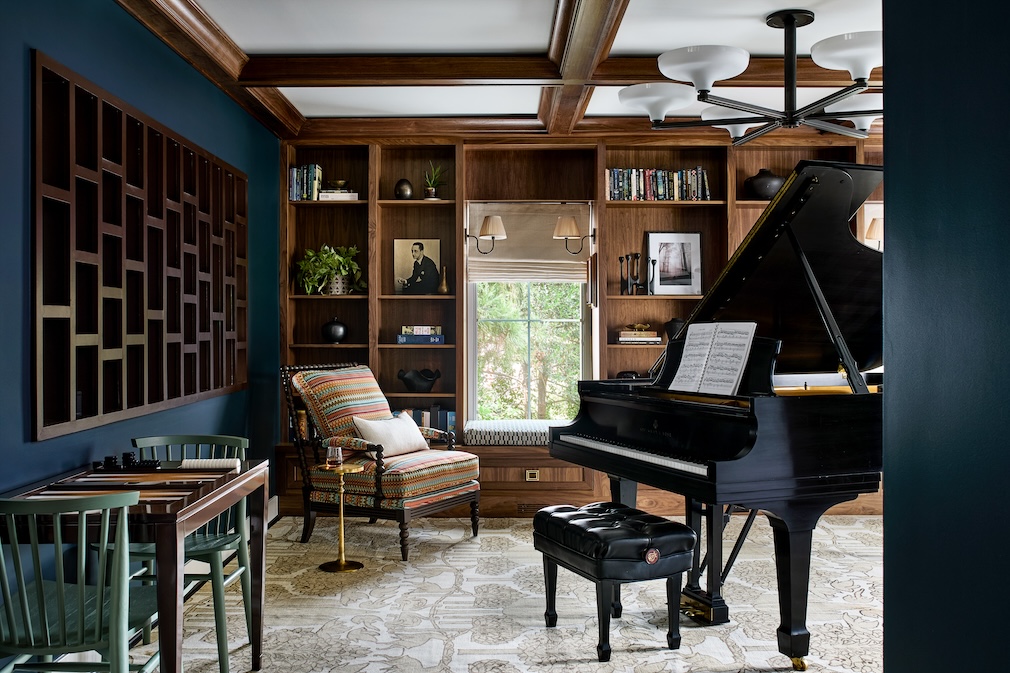 Drawing inspiration from a walnut custom table handmade by the client’s father, Julia added walnut-coffered ceilings to the living, dining, and piano room spaces on the first floor. The coffered ceilings feature a dimmable, hidden lighting element, adding much-needed light to the space without detracting from the coffered design with recessed cans. In the dining room, Julia also kept the client’s existing rug, adding in an eclectic mix of dining chairs and a dramatically oversized custom chandelier from Urban Electric.