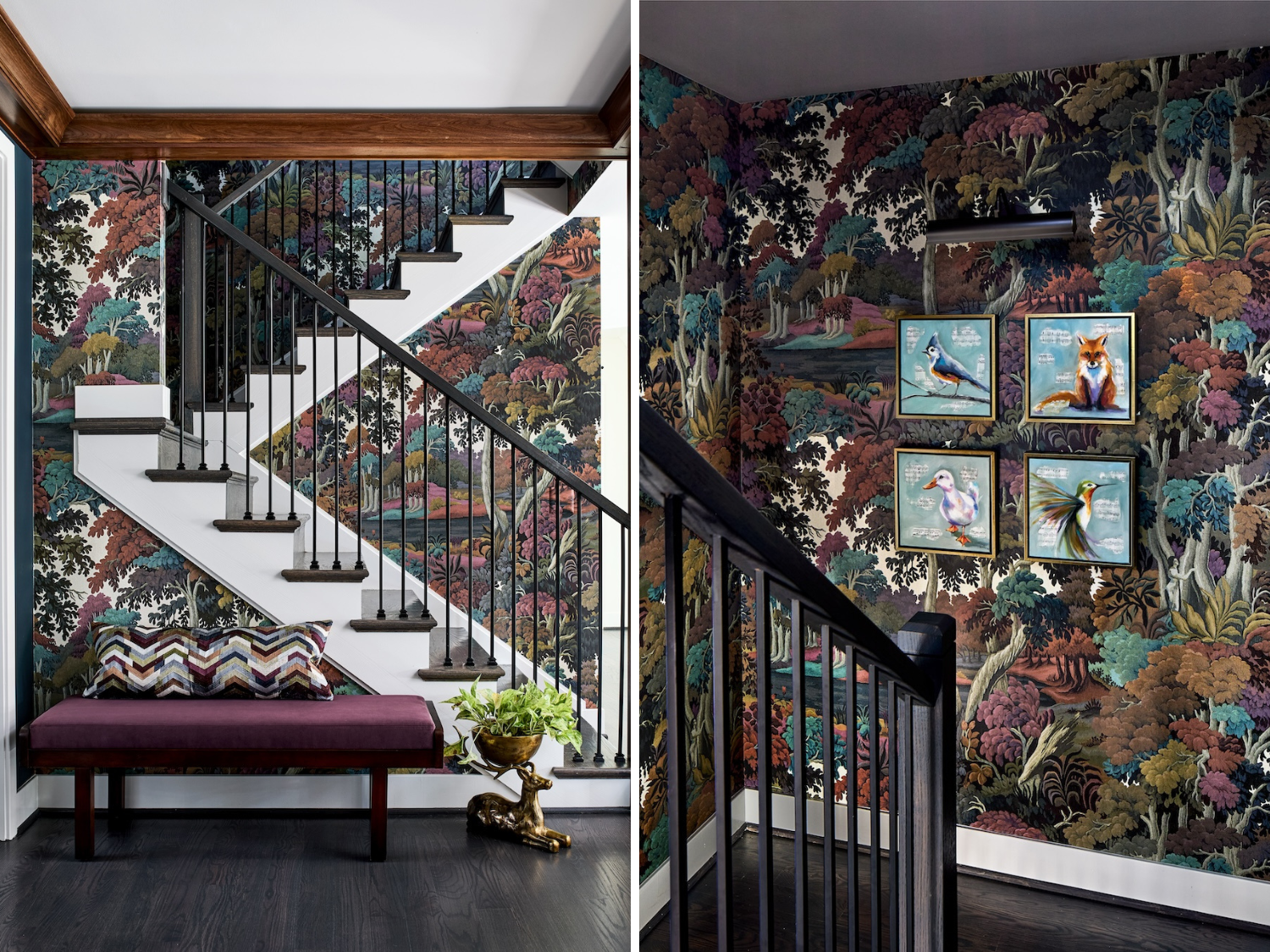 The entryway and stairwell feature House of Hackney wallpaper, Urban Electric lighting, a custom Kravet bench, a brass deer bowl, and four specially commissioned pieces of artwork from Wendy Bilas. The client, an avid pianist and animal lover, selected four favorite piano pieces and woodland creatures to be included in the paintings.