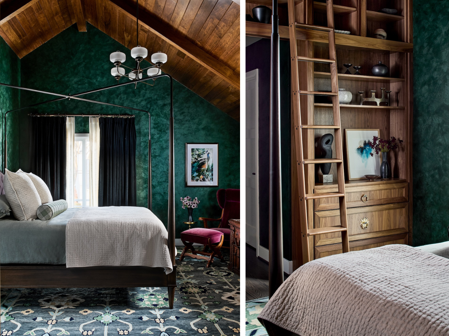 What was previously two separate bedrooms were combined to create a grand owner’s suite. The adjacent bedroom was closed off from the hallway, and a hidden bookcase entrance from the primary bedroom was added, offering privacy and a retreat to relax and wind down. The bedroom features custom-dyed deep green Venetian plaster on the walls with tongue and groove walnut treatment on the ceiling. A Vanguard canopy bed emphasizes the grand height of the bedroom. A 19th-century pine trunk, expertly restored by Shoenbauer Furniture Restoration, and a vintage European chair were imported to add old-world elegance to the space.