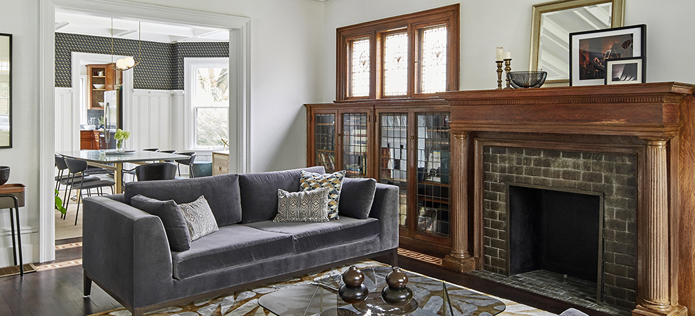“The house was quite traditional, so we wanted something modern and comfortable to contrast that,” Rossouw adds. Morris picked up on her client’s love of pattern and wallcoverings to accomplish this. In the dining room, for instance, she lightened the brooding Arts & Crafts wainscoting with white paint, boxed the fireplace in large-format Thassos marble tile and added a graphic Artistic Tile pattern to the hearth floor. Then she covered the remaining wall space with a Holland & Sherry Deco-like paper. Furnishings were a blend of practical, accessibly priced pieces (a CB2 sideboard and host chairs) and other furnishings that speak to the period of the house through their handcrafted nature (a Larose Guyon chandelier from Room in Tribeca, a Wüd dining table). This approach threads throughout.
