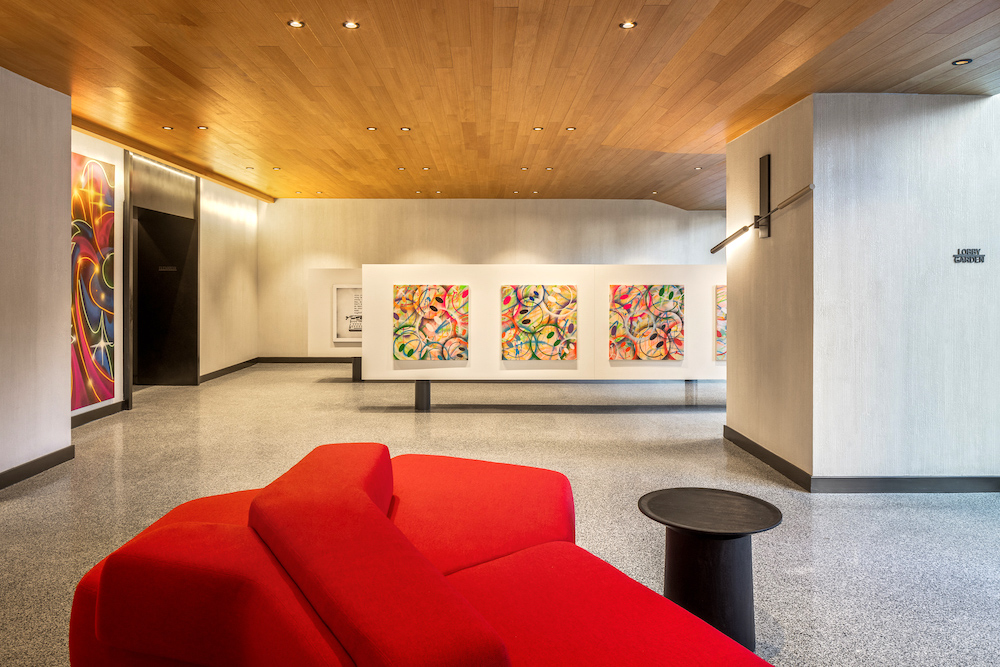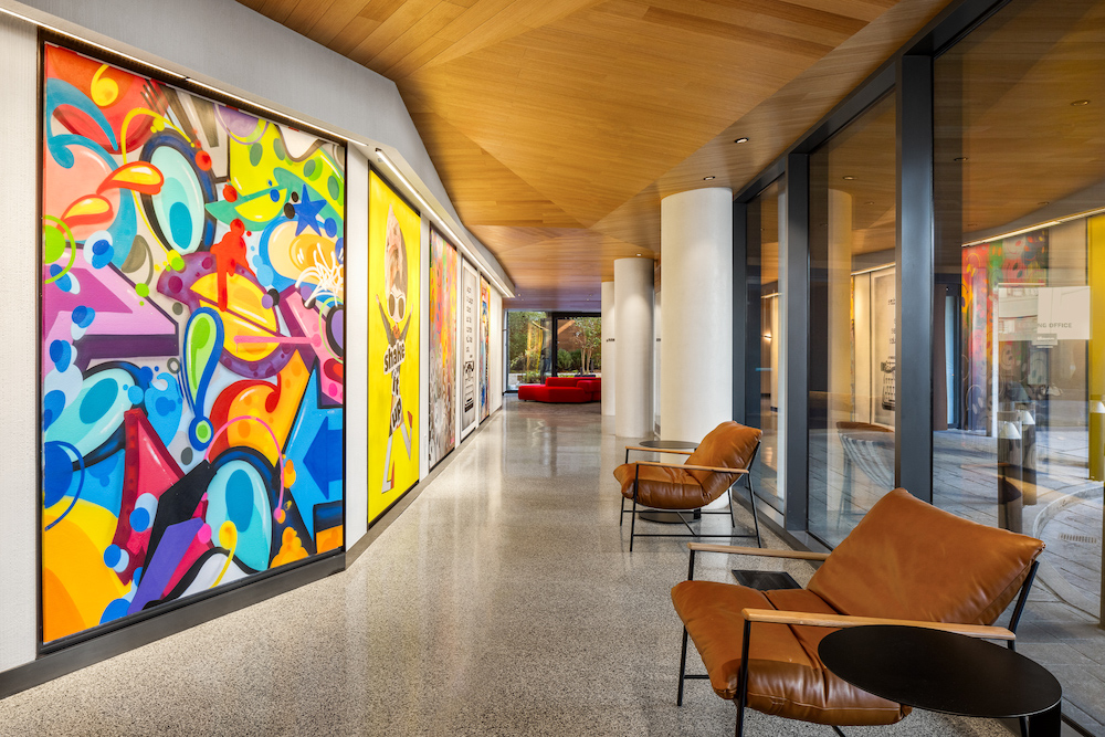 Both the developer and architects believed that living with art enriches the lives of residents and provides daily inspiration. “A true highlight of Maven’s art program is the entire ground floor pedestrian and vehicular entry sequence and lobby. The long sinuous lobby was conceived as a gallery with a 115-foot-long wall of exhibition space with a facing glass wall that allows people to experience the art from the street and as they approach the building on foot or in vehicles,” Ruddy noted. “The entire indoor and outdoor art experience space is energized by art, complete with wall-to-wall and floor-to-ceiling works.” Works were commissioned from celebrated international and local artists, including Mr. Brainwash, WRDSMTH, Bollee Patino, Cope 2, CRASH, Plastic Jesus and Jimmy Paintz.