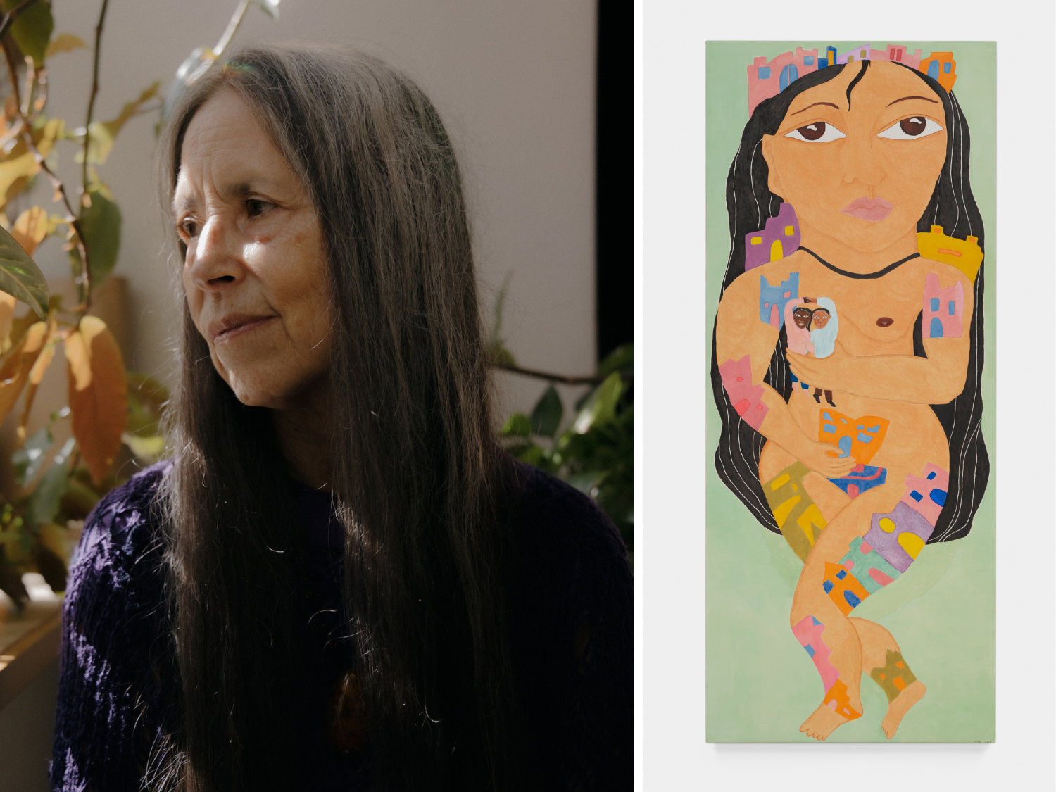Cecilia Vicuña. (R) “Santa Bárbara” 2024, oil on canvas, 28″ w x 69″ h