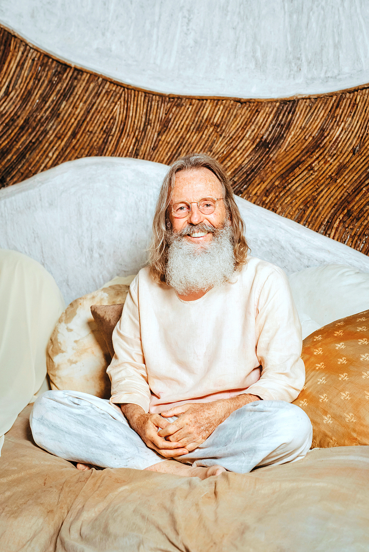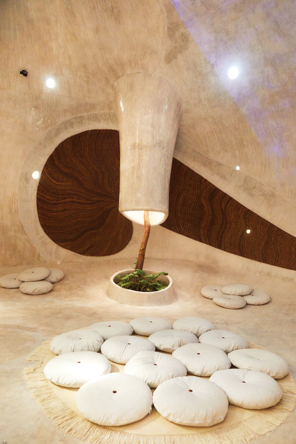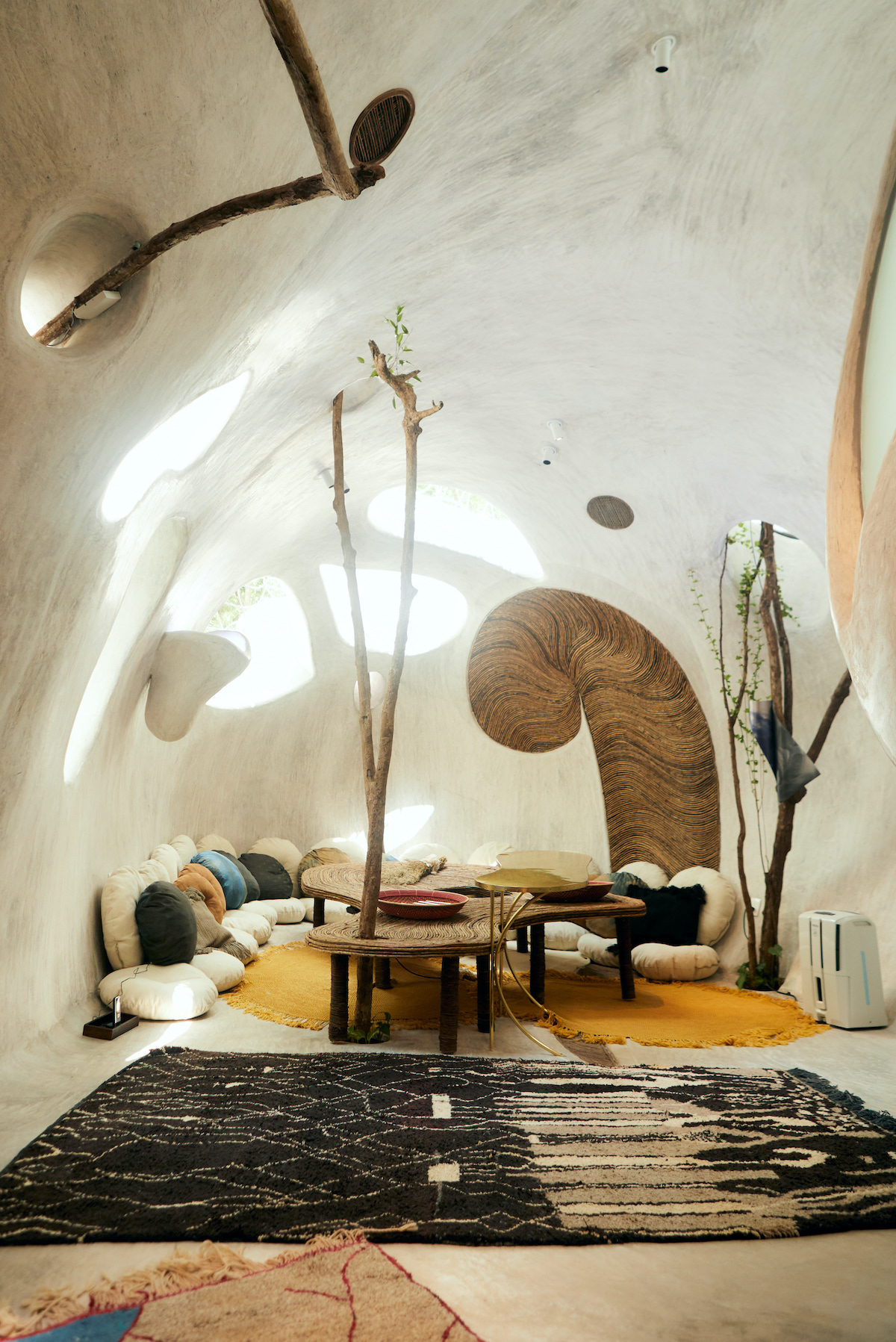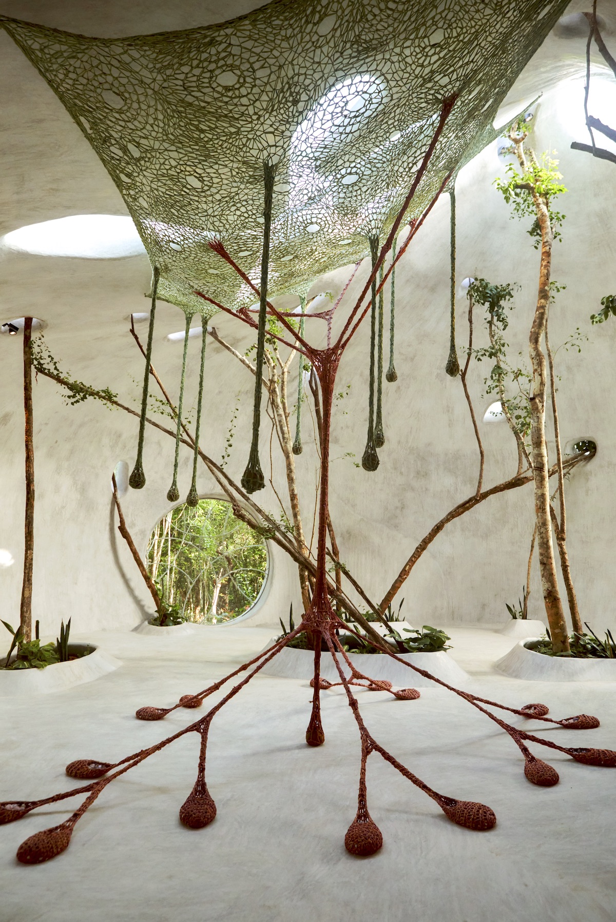 In every room, ROTH submits to “the order of things,” allowing nature to flow in, epitomizing his approach to the built environment. With its natural materials and view to the outdoors, this sitting area flows organically, exuding a sense of peace and comfort. In a guest suite’s sitting room, teardrop windows cast pools of light across the space, while a multipurpose room used for artists’ talks and screenings features a sort of inverted chimney that brings light to indoor plantings. An installation by Ernesto Neto, Every Tree is a Civilized Entity, is made of crocheted cotton, amethyst, rose, quartz, and river stones.