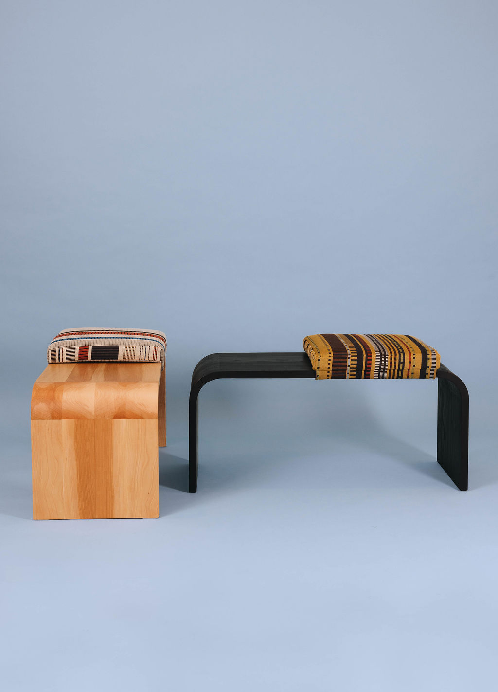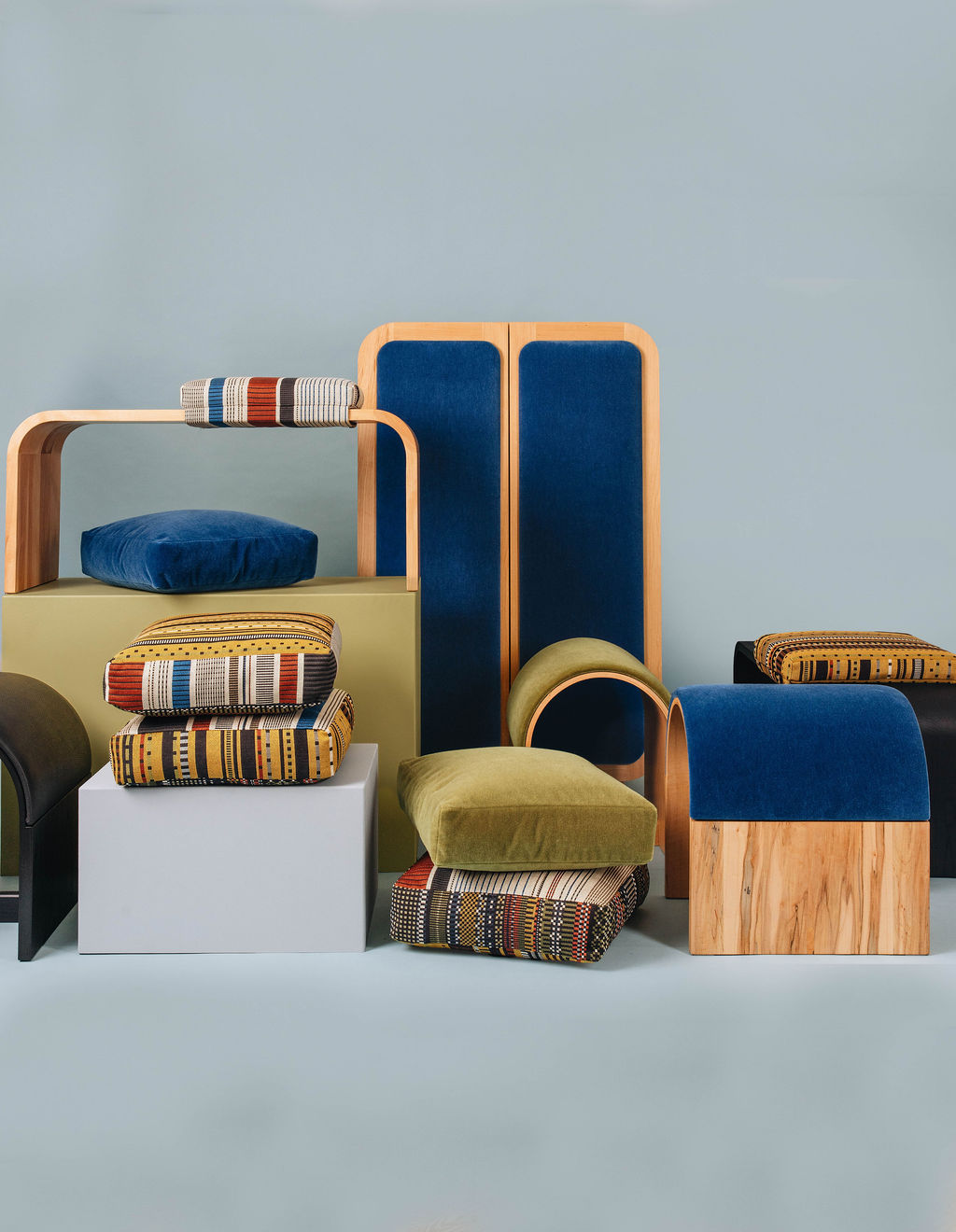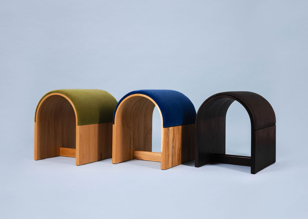o.ottoman: A versatile, U-shaped 18-inch curved stool with removable, interchangeable upholstery. Available in ambrosia maple, beech, and blackened ash and four designer fabrics.
